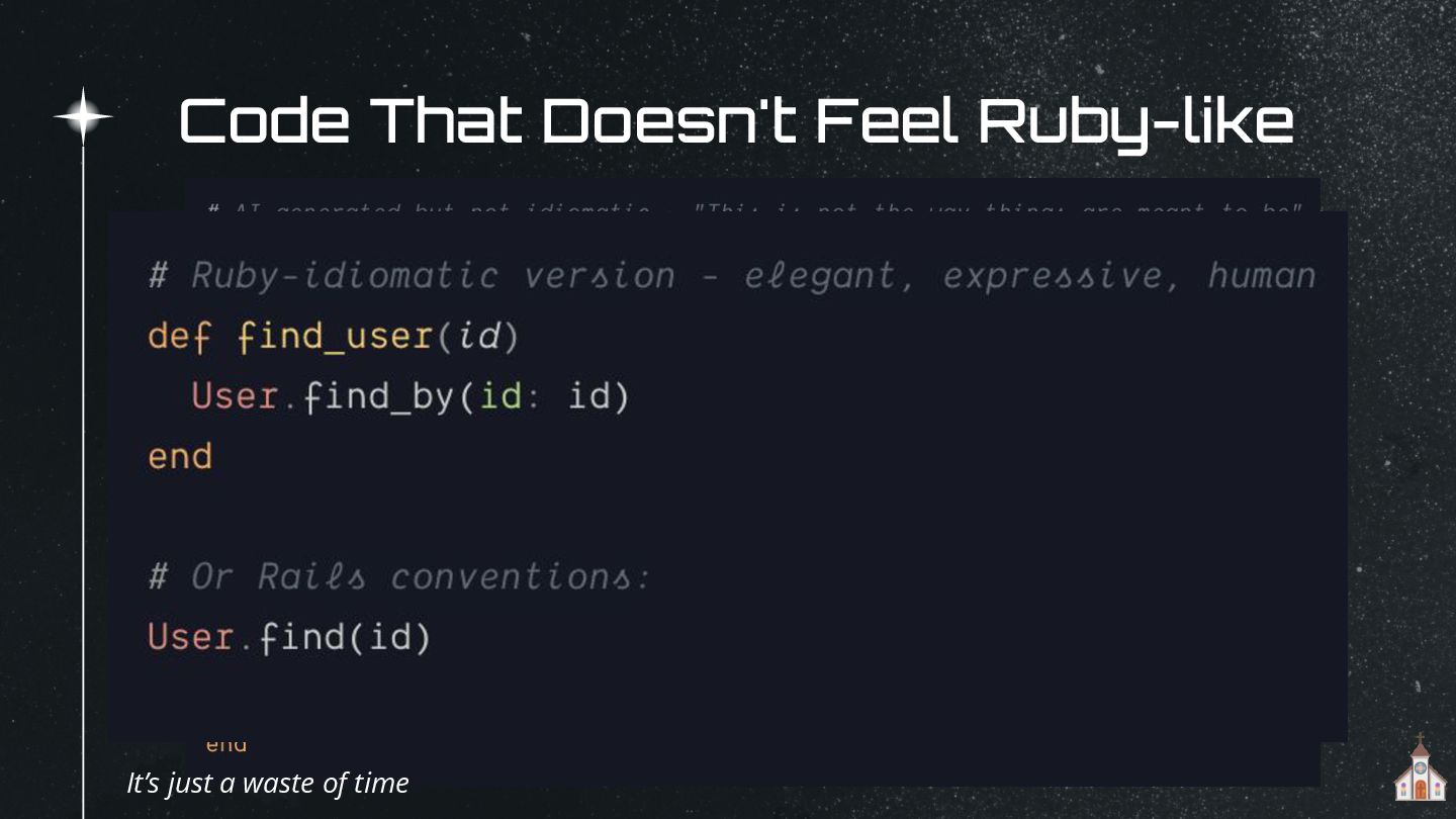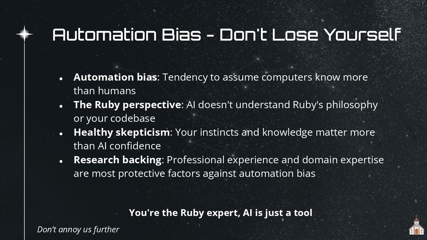 Tendency to assume computers know more than humans • The Ruby perspective: AI doesn't understand Ruby's philosophy or your codebase • Healthy skepticism: Your instincts and knowledge matter more than AI confidence • Research backing: Professional experience and domain expertise are most protective factors against automation bias You're the Ruby expert, AI is just a tool Don’t annoy us further