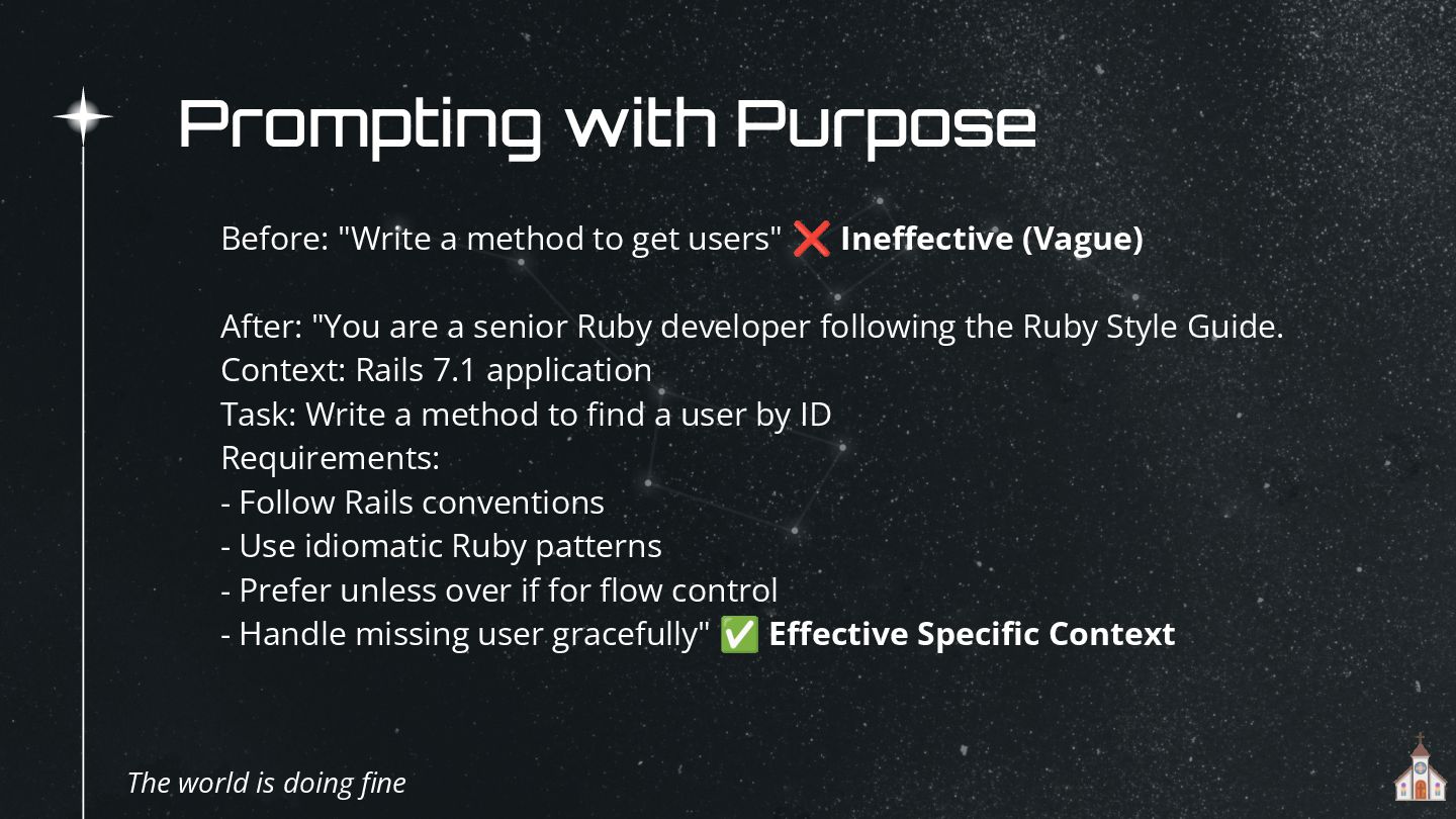 ❌ Ineffective (Vague) After: "You are a senior Ruby developer following the Ruby Style Guide. Context: Rails 7.1 application Task: Write a method to find a user by ID Requirements: - Follow Rails conventions - Use idiomatic Ruby patterns - Prefer unless over if for flow control - Handle missing user gracefully" ✅ Effective Specific Context ⛪ The world is doing fine
