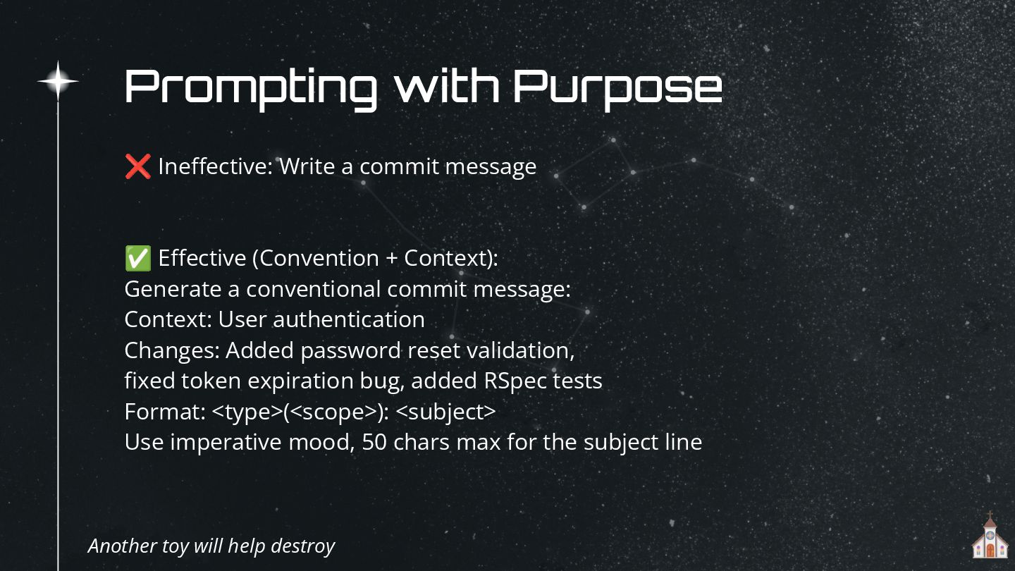 Effective (Convention + Context): Generate a conventional commit message: Context: User authentication Changes: Added password reset validation, fixed token expiration bug, added RSpec tests Format: <type>(<scope>): <subject> Use imperative mood, 50 chars max for the subject line ⛪ Another toy will help destroy