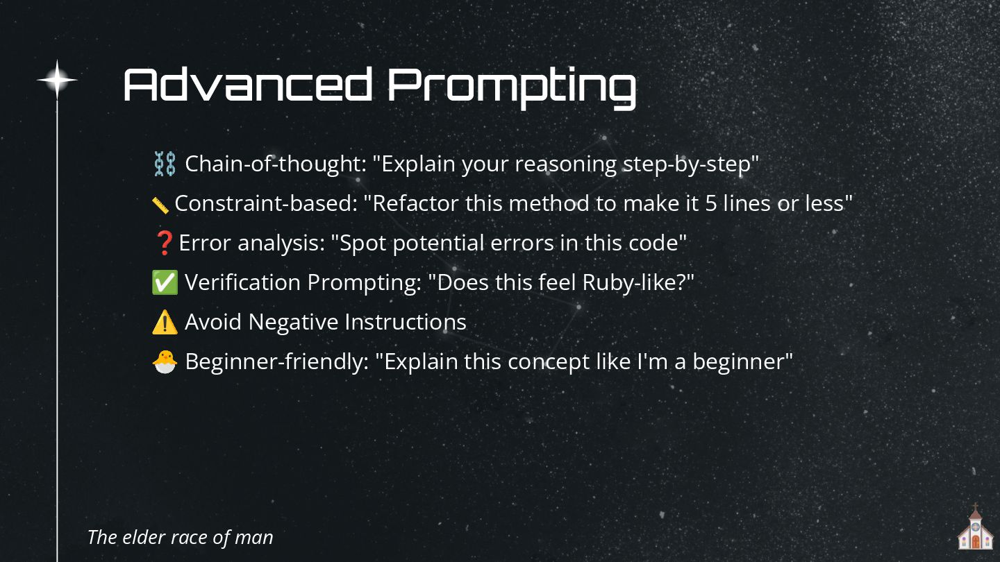 "Refactor this method to make it 5 lines or less" ❓Error analysis: "Spot potential errors in this code" ✅ Verification Prompting: "Does this feel Ruby-like?" ⚠ Avoid Negative Instructions 🐣 Beginner-friendly: "Explain this concept like I'm a beginner" ⛪ The elder race of man