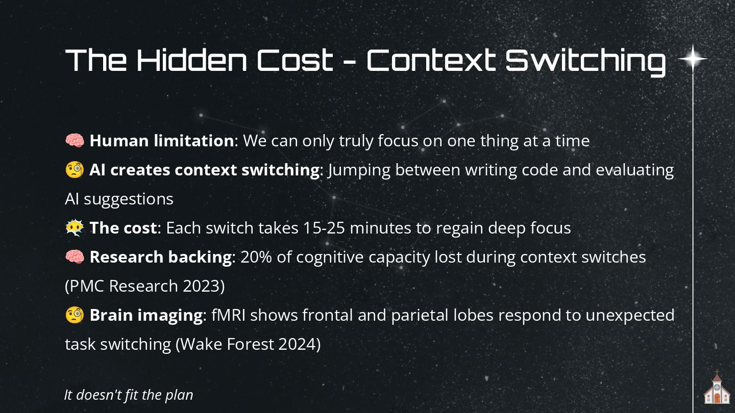 can only truly focus on one thing at a time 🧐 AI creates context switching: Jumping between writing code and evaluating AI suggestions 󰷻 The cost: Each switch takes 15-25 minutes to regain deep focus 🧠 Research backing: 20% of cognitive capacity lost during context switches (PMC Research 2023) 🧐 Brain imaging: fMRI shows frontal and parietal lobes respond to unexpected task switching (Wake Forest 2024) ⛪ It doesn't fit the plan