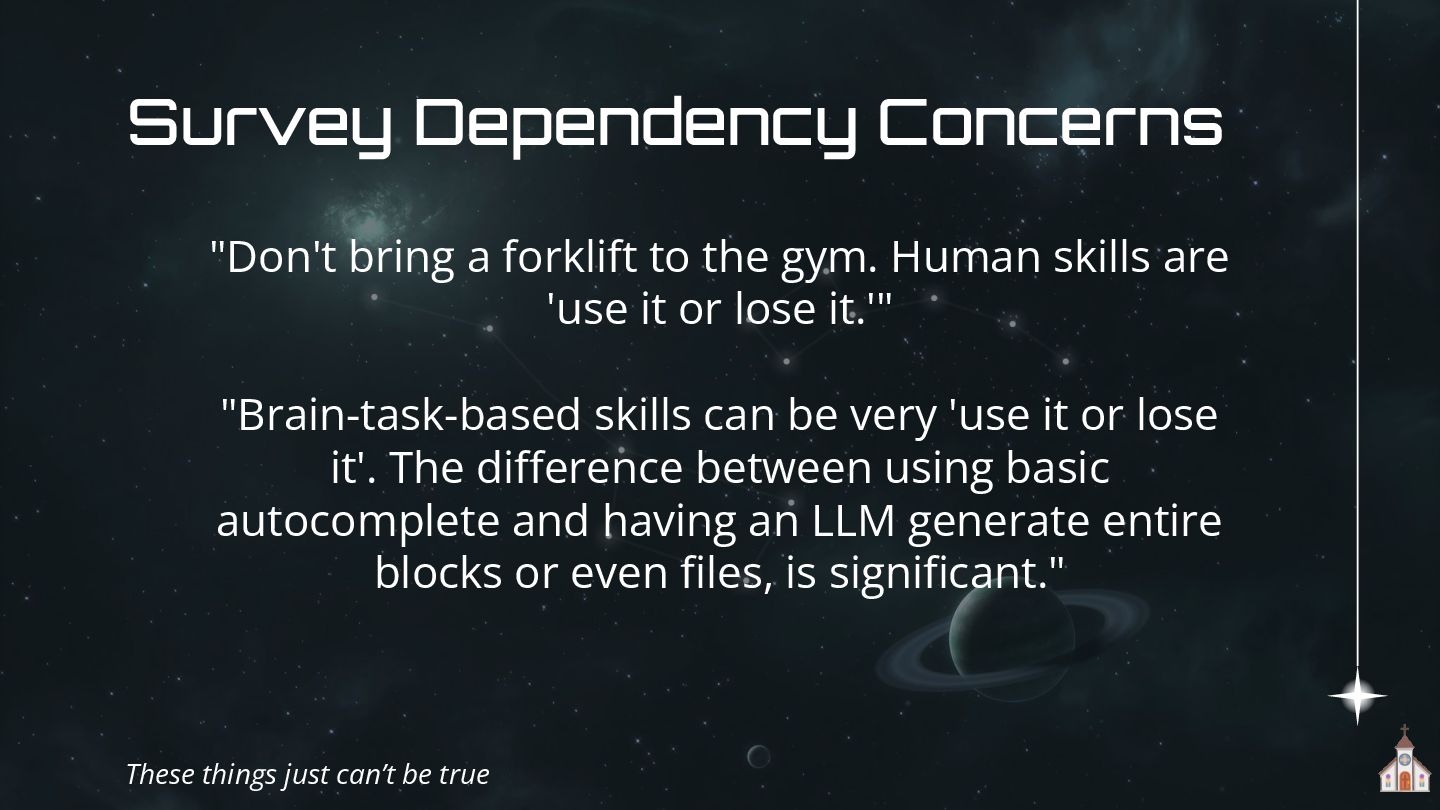 gym. Human skills are 'use it or lose it.'" "Brain-task-based skills can be very 'use it or lose it'. The difference between using basic autocomplete and having an LLM generate entire blocks or even files, is significant." These things just can’t be true