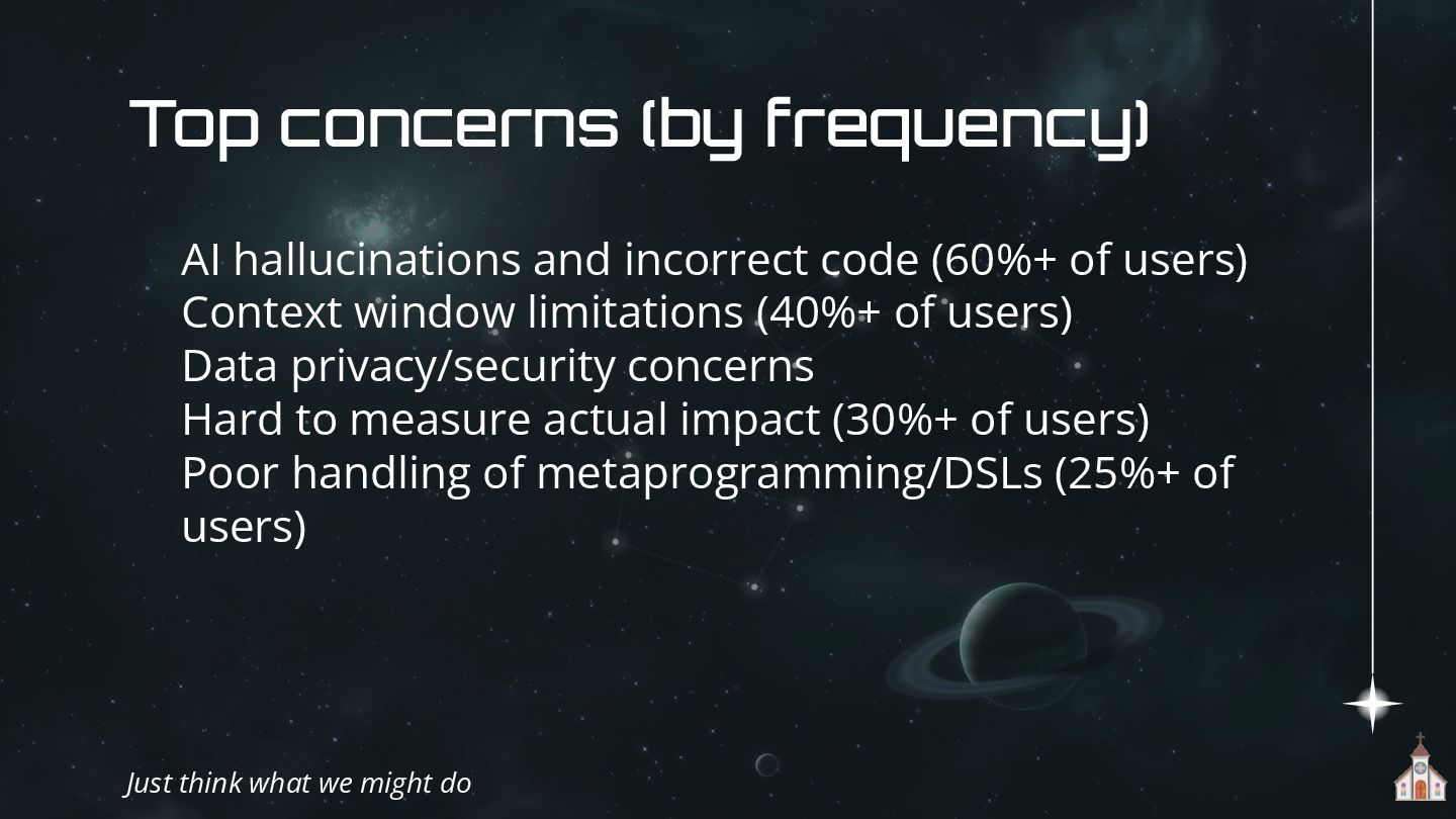 (60%+ of users) Context window limitations (40%+ of users) Data privacy/security concerns Hard to measure actual impact (30%+ of users) Poor handling of metaprogramming/DSLs (25%+ of users) Just think what we might do