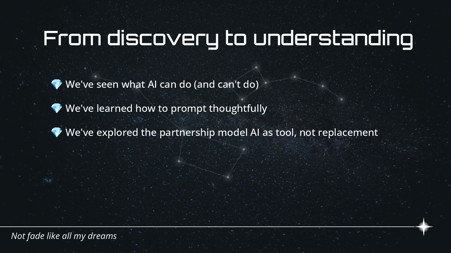 do (and can't do) 💎 We've learned how to prompt thoughtfully 💎 We've explored the partnership model AI as tool, not replacement Not fade like all my dreams