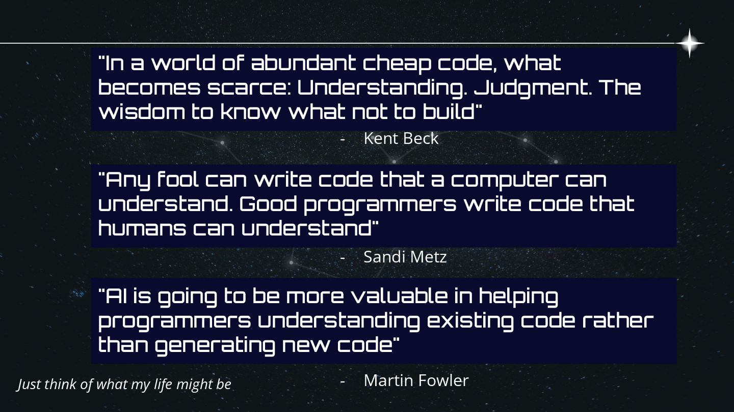 Understanding. Judgment. The wisdom to know what not to build" - Kent Beck "Any fool can write code that a computer can understand. Good programmers write code that humans can understand" - Sandi Metz "AI is going to be more valuable in helping programmers understanding existing code rather than generating new code" - Martin Fowler Just think of what my life might be