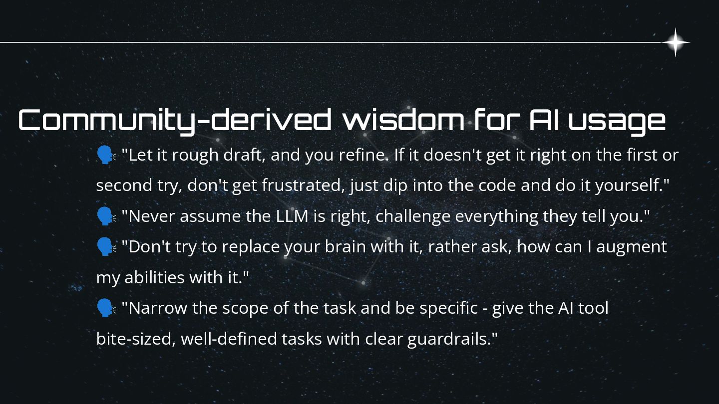 and you refine. If it doesn't get it right on the first or second try, don't get frustrated, just dip into the code and do it yourself." 🗣 "Never assume the LLM is right, challenge everything they tell you." 🗣 "Don't try to replace your brain with it, rather ask, how can I augment my abilities with it." 🗣 "Narrow the scope of the task and be specific - give the AI tool bite-sized, well-defined tasks with clear guardrails."