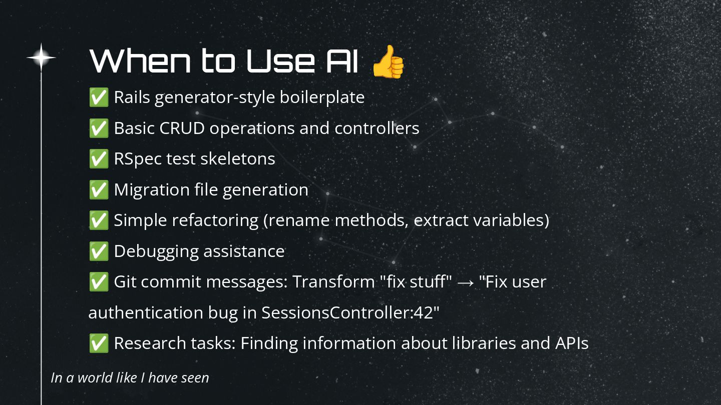 Basic CRUD operations and controllers ✅ RSpec test skeletons ✅ Migration file generation ✅ Simple refactoring (rename methods, extract variables) ✅ Debugging assistance ✅ Git commit messages: Transform "fix stuff" → "Fix user authentication bug in SessionsController:42" ✅ Research tasks: Finding information about libraries and APIs In a world like I have seen