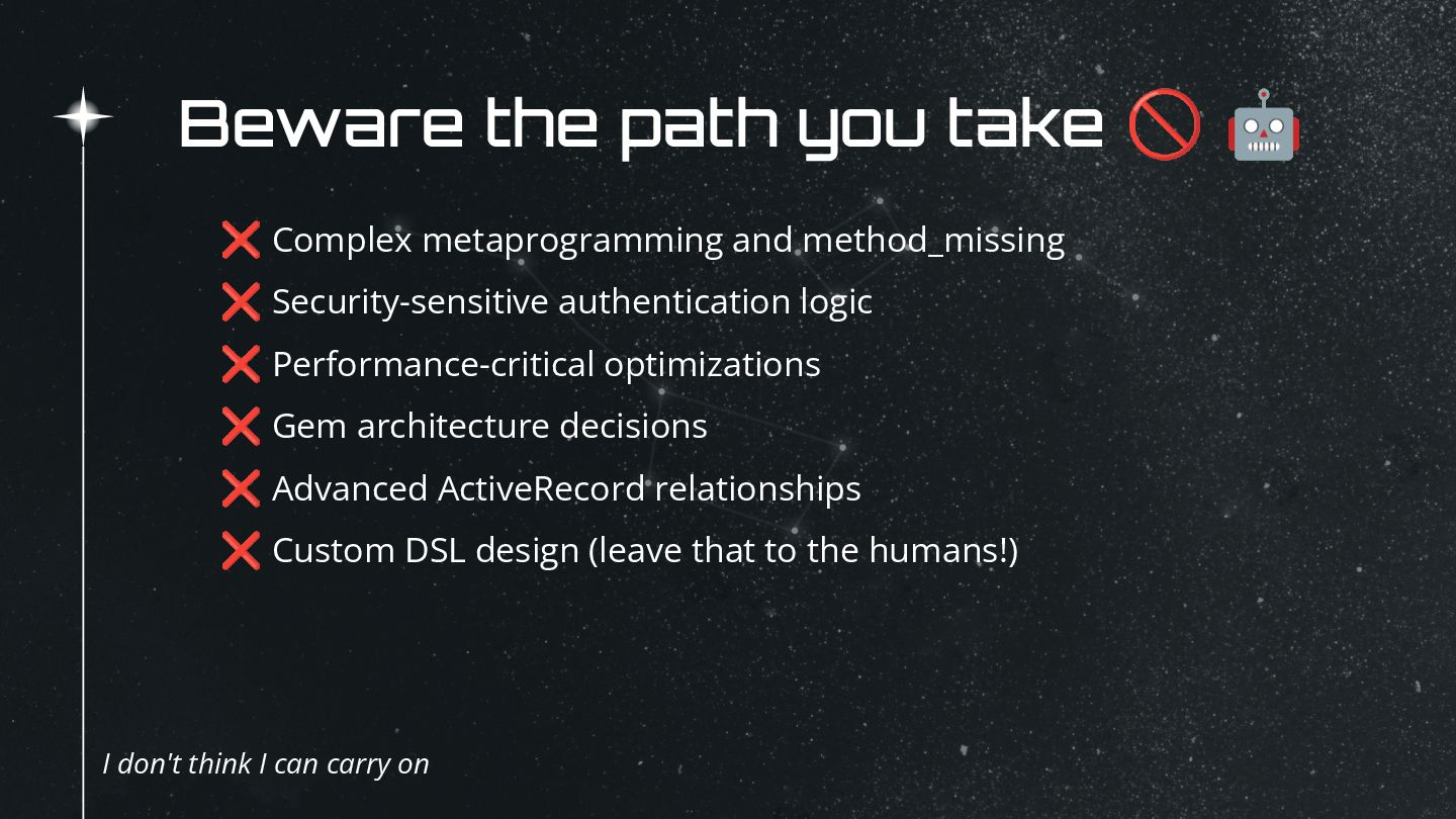 and method_missing ❌ Security-sensitive authentication logic ❌ Performance-critical optimizations ❌ Gem architecture decisions ❌ Advanced ActiveRecord relationships ❌ Custom DSL design (leave that to the humans!) I don't think I can carry on