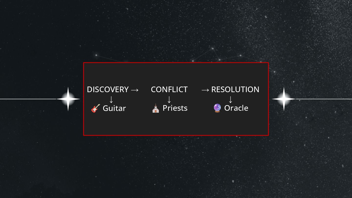 9. DISCOVERY ✅ → ↓ 🎸 Guitar CONFLICT ↓ ⛪ Priests