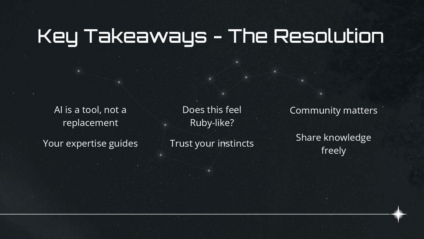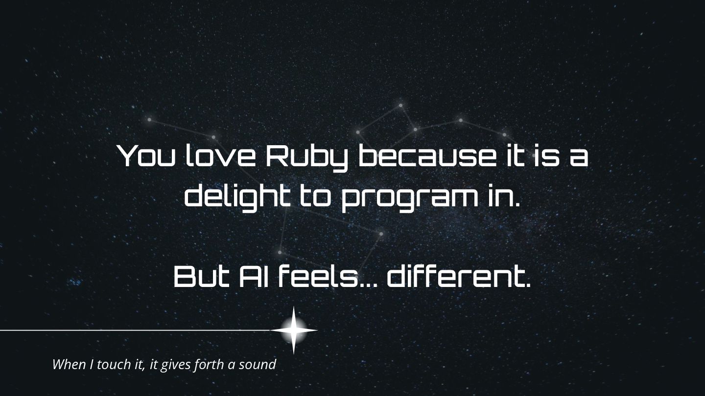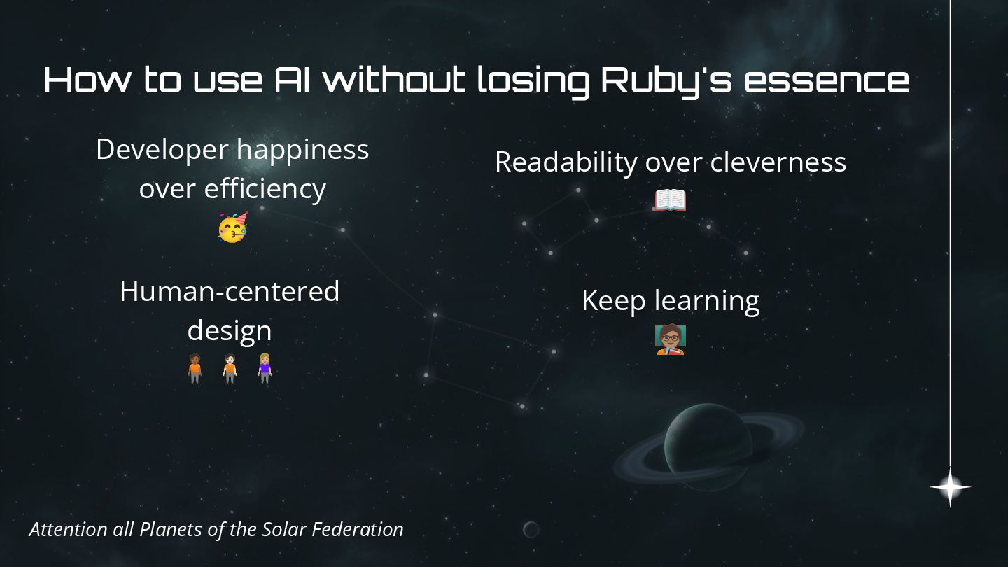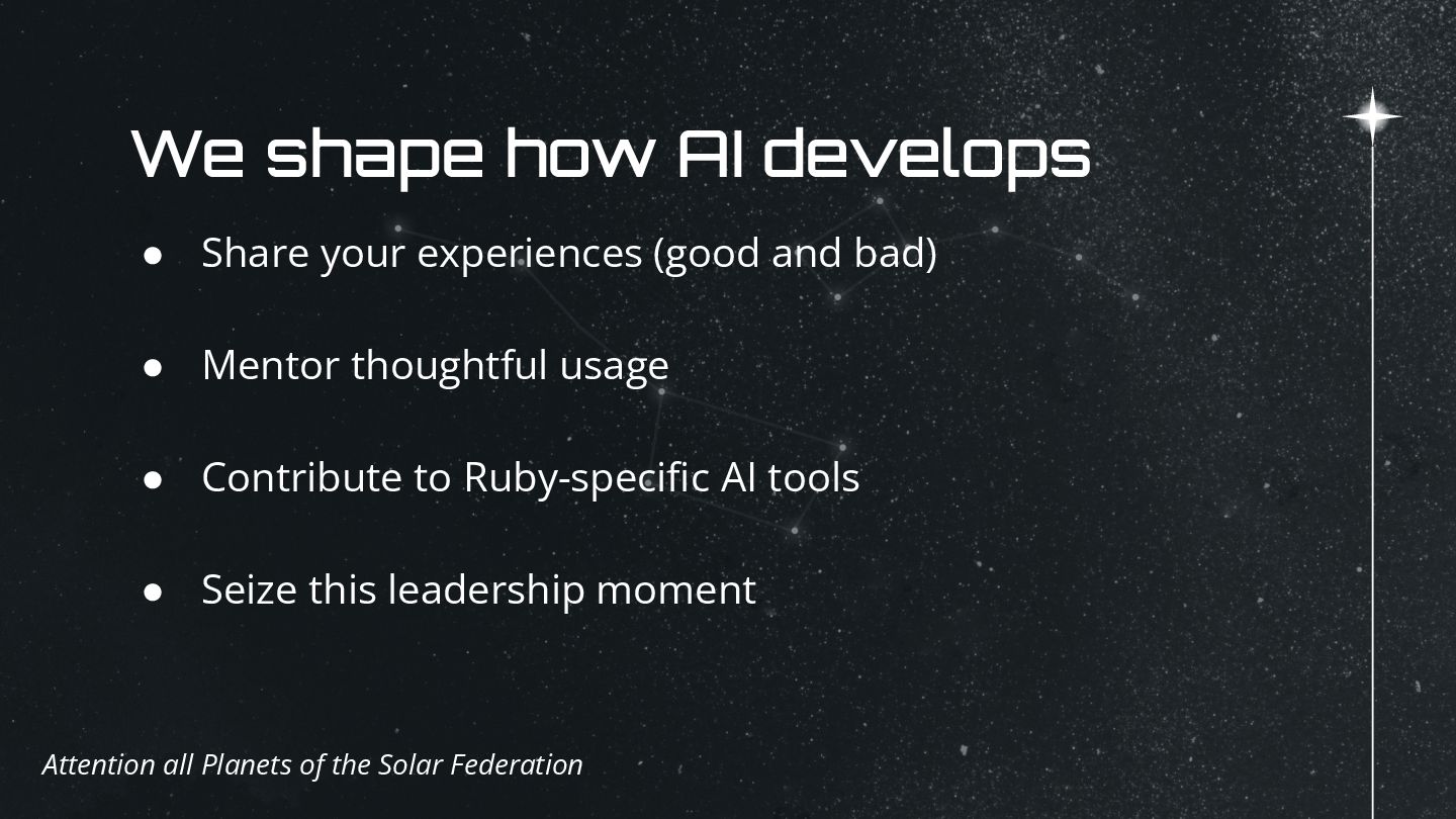and bad) • Mentor thoughtful usage • Contribute to Ruby-specific AI tools • Seize this leadership moment Attention all Planets of the Solar Federation