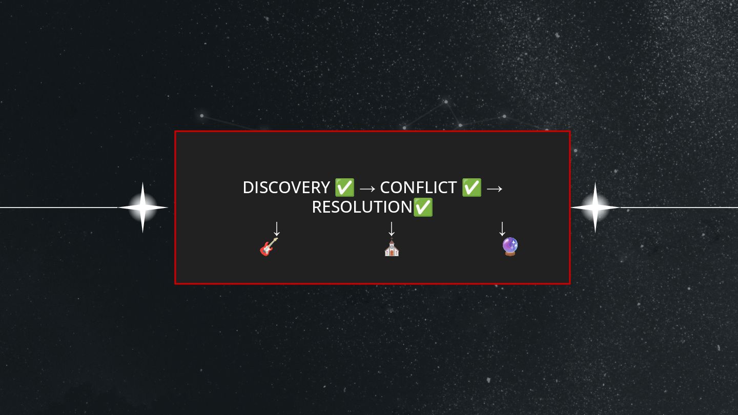 22. DISCOVERY ✅ → ↓ 🎸 Guitar CONFLICT ✅ ↓ ⛪