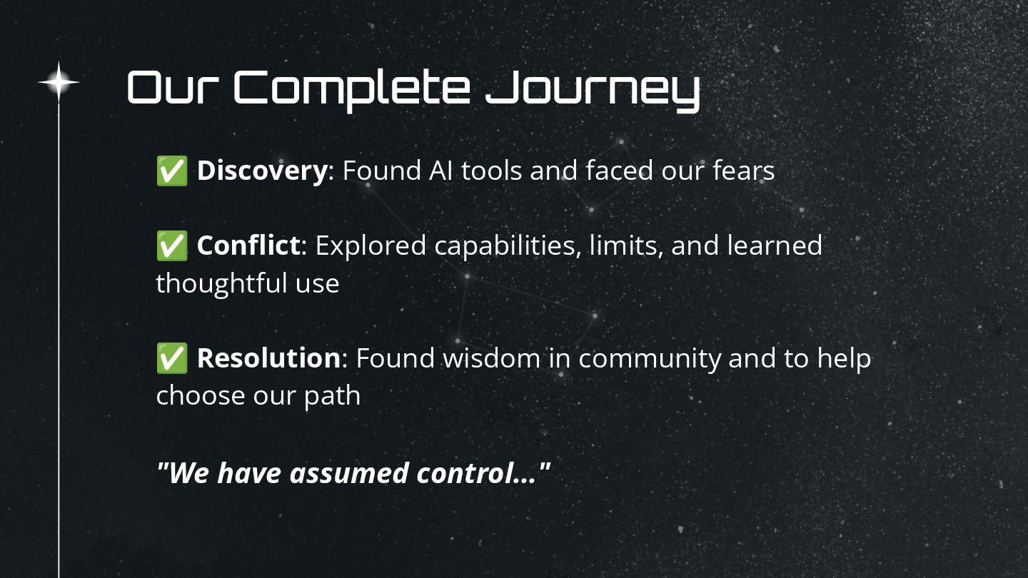 our fears ✅ Conflict: Explored capabilities, limits, and learned thoughtful use ✅ Resolution: Found wisdom in community and to help choose our path "We have assumed control..."