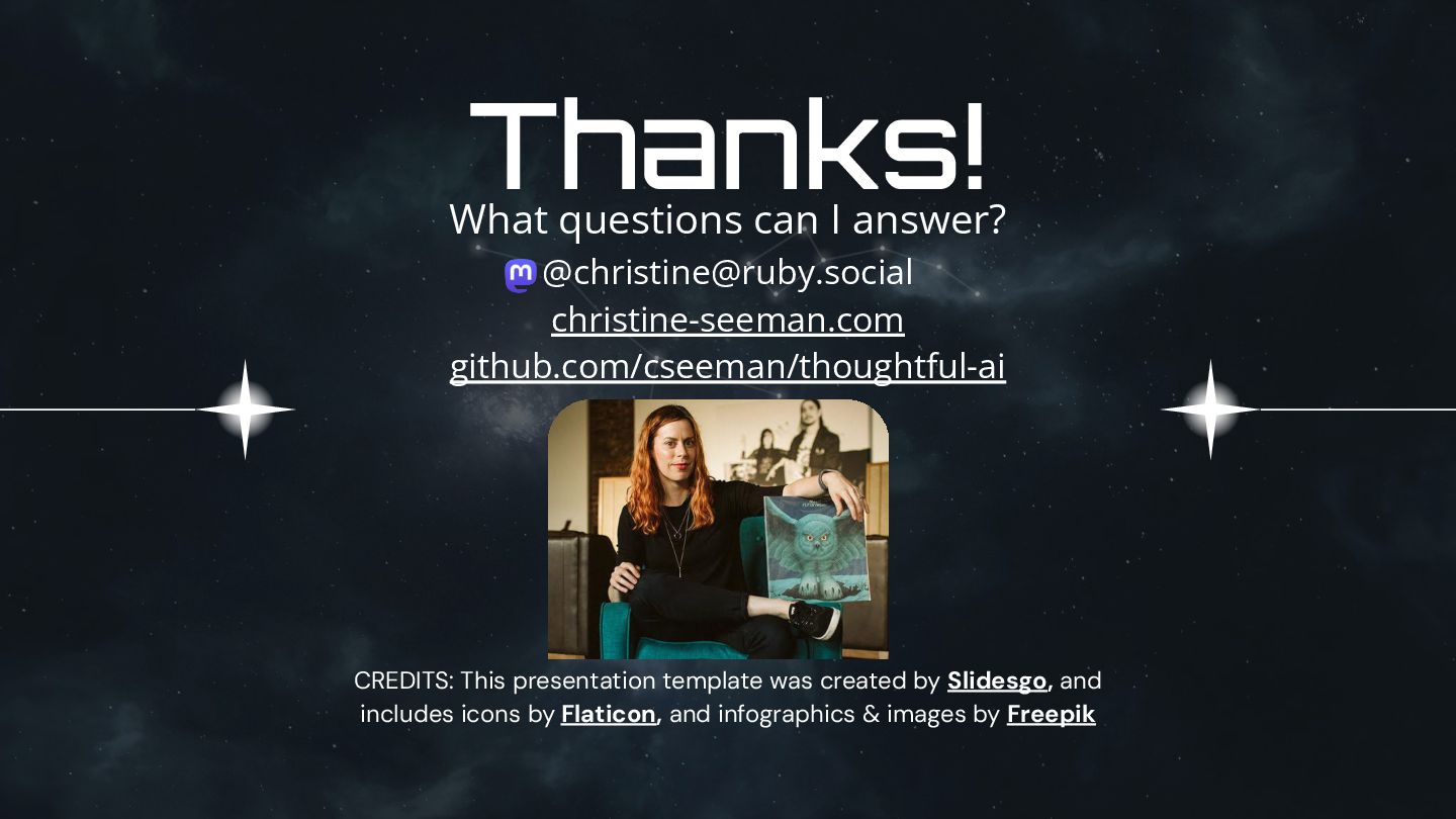 icons by Flaticon, and infographics & images by Freepik Thanks! What questions can I answer? @[email protected] christine-seeman.com github.com/cseeman/thoughtful-ai