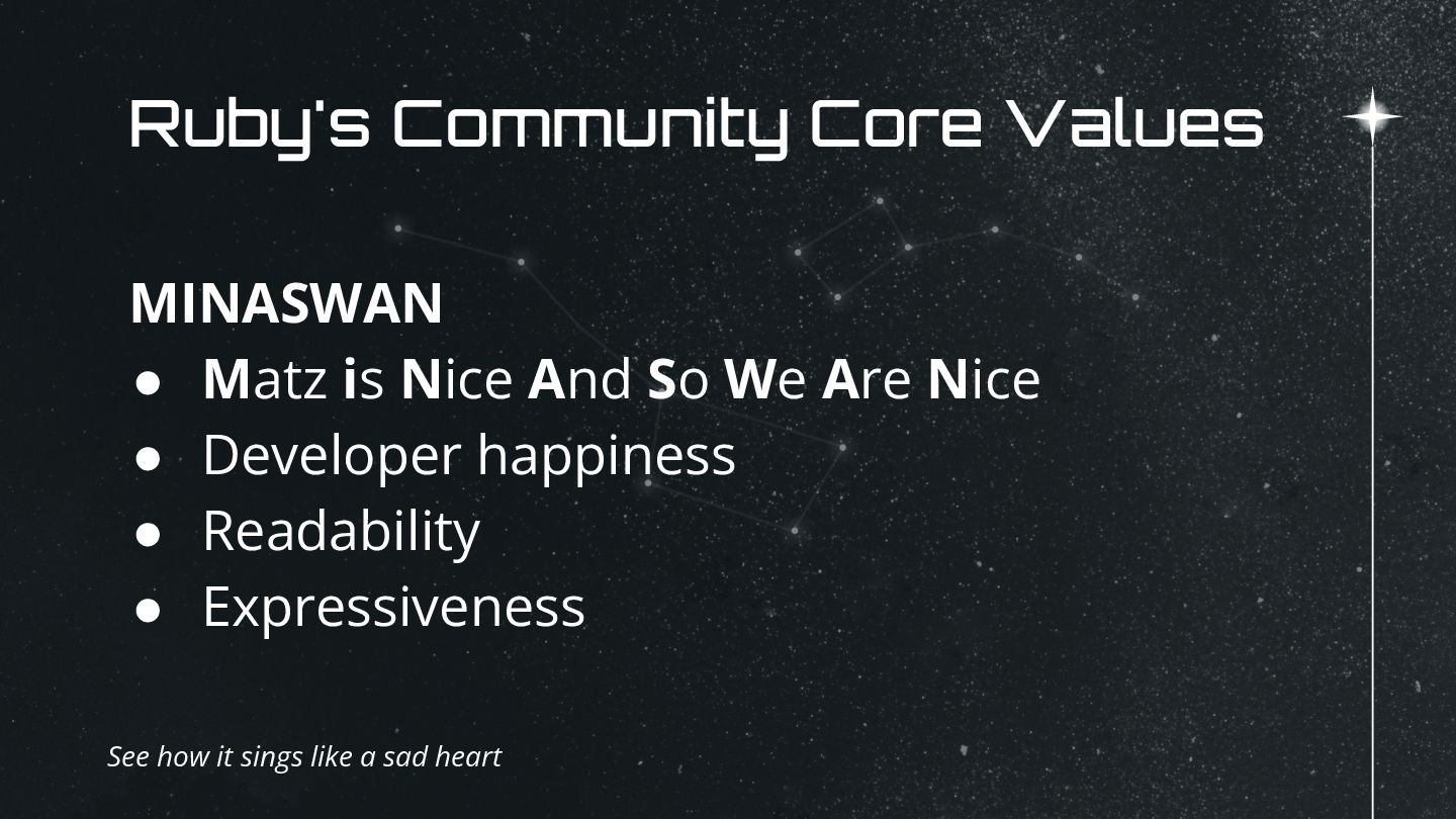 3. Ruby's Community Core Values MINASWAN • Matz is Nice And