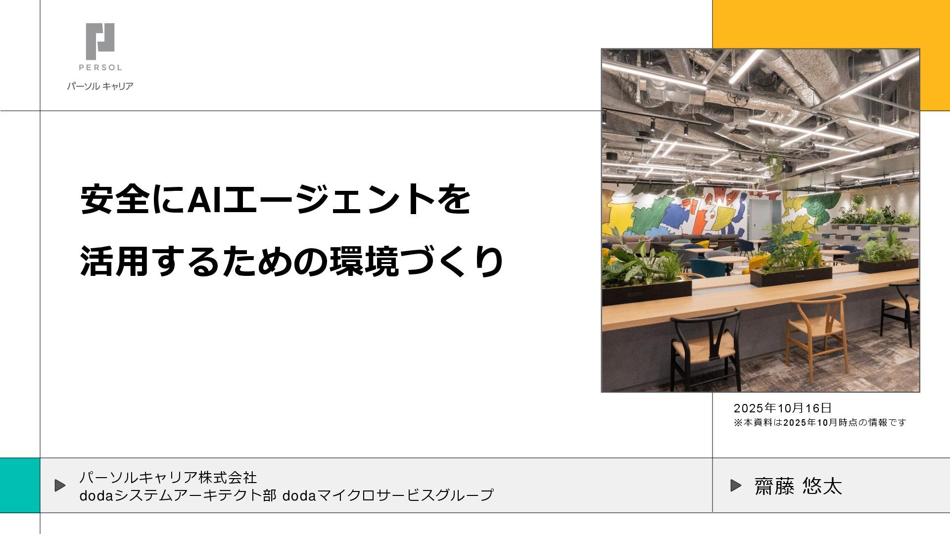 安全にAIエージェントを 活用するための環境づくり パーソルキャリア株式会社 dodaシステムアーキテクト部 dodaマイクロサービスグループ 2025年10月16日 ※本資料は2025年10月時点の情報です 齋藤 悠太