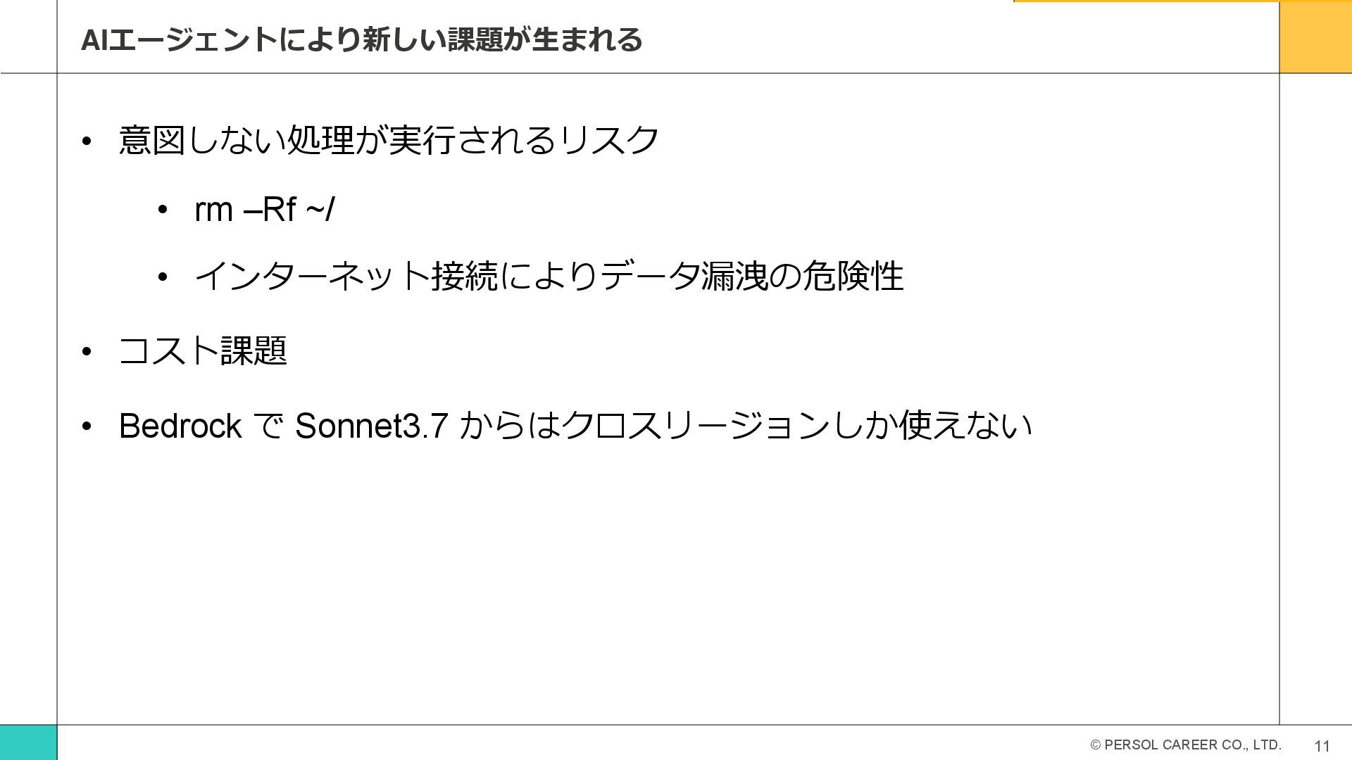 © PERSOL CAREER CO., LTD. 11 AIエージェントにより新しい課題が生まれる • 意図しない処理が実行されるリスク •