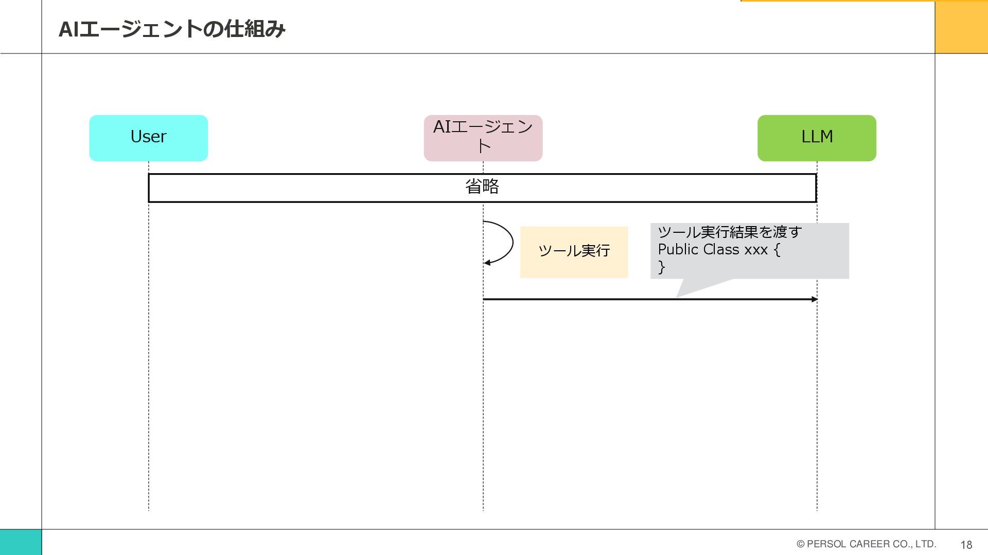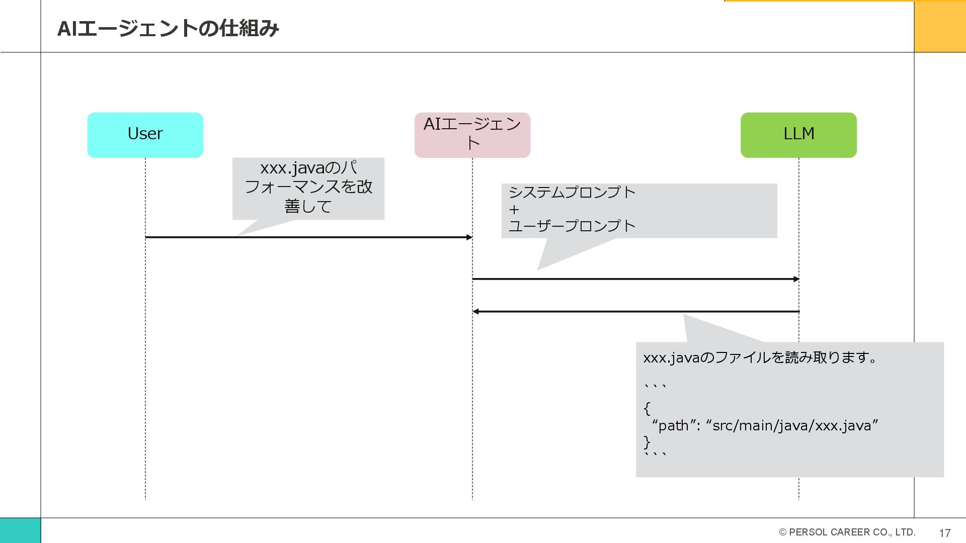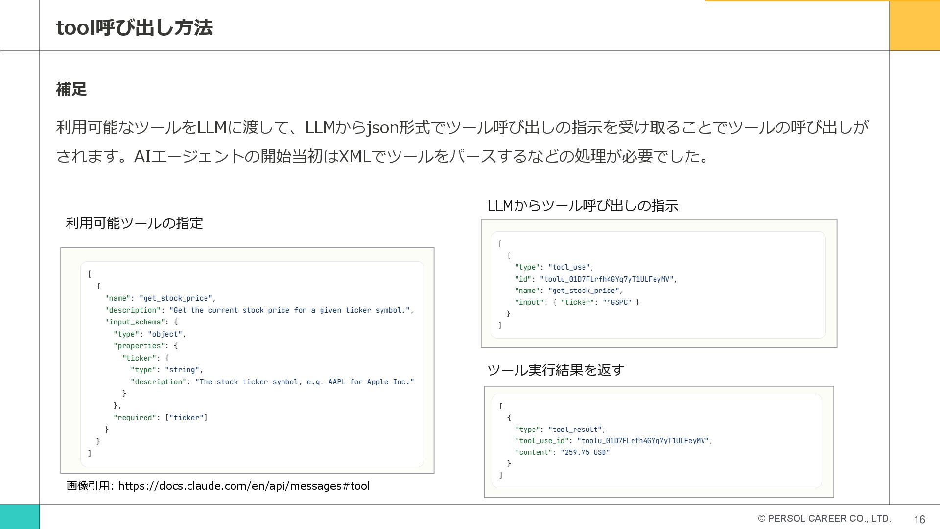 © PERSOL CAREER CO., LTD. 16 tool呼び出し方法 補足 利用可能なツールをLLMに渡して、LLMからjson形式でツール呼び出しの指示を受け取ることでツールの呼び出しが されます。AIエージェントの開始当初はXMLでツールをパースするなどの処理が必要でした。