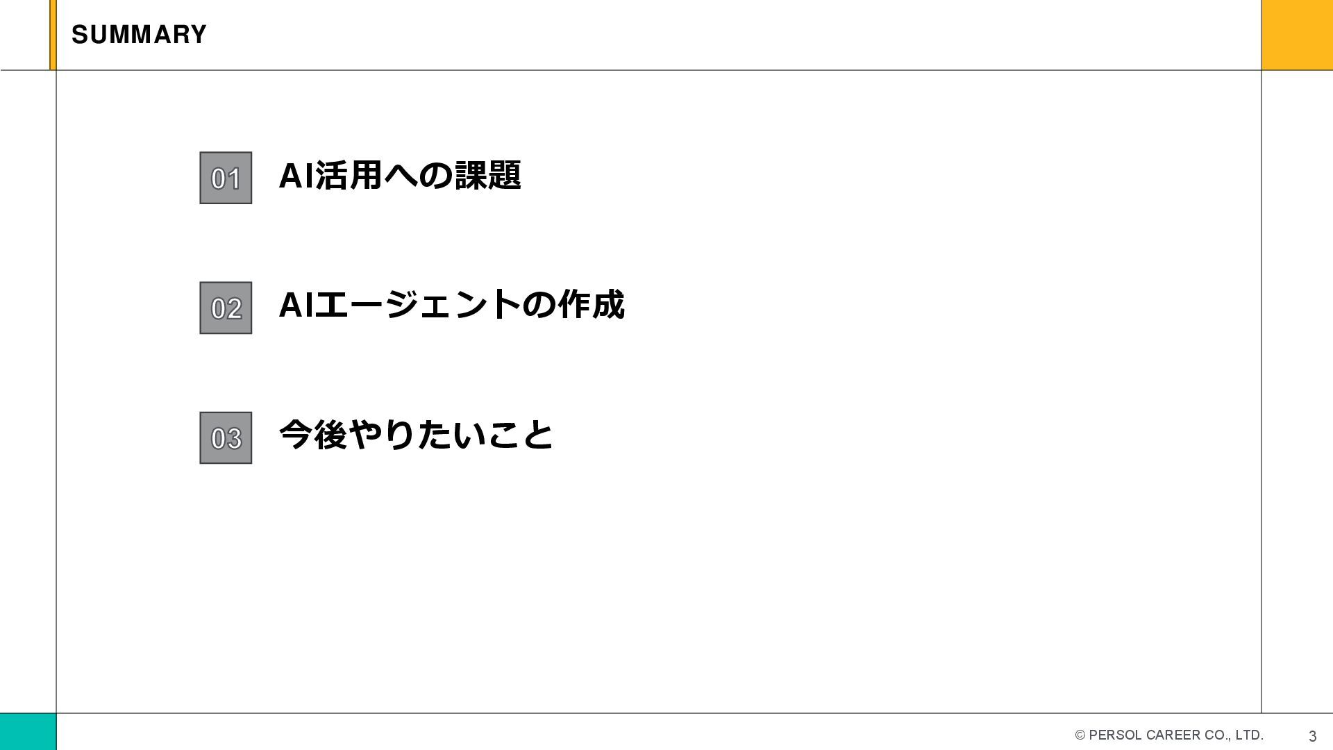 © PERSOL CAREER CO., LTD. AI活用への課題 01 AIエージェントの作成 02 今後やりたいこと