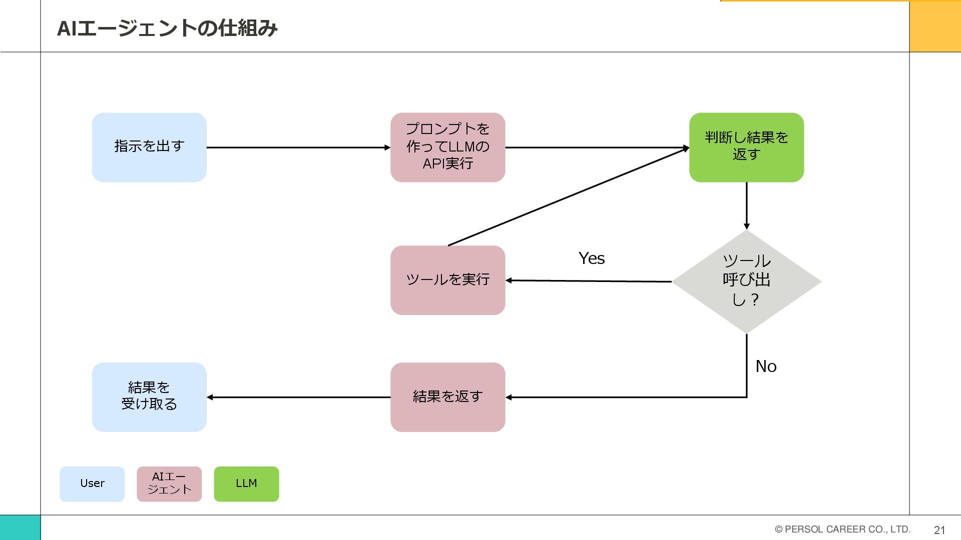 © PERSOL CAREER CO., LTD. 21 AIエージェントの仕組み 指示を出す プロンプトを 作ってLLMの