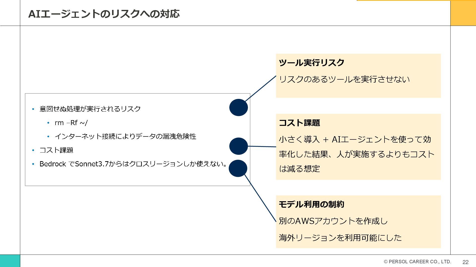 © PERSOL CAREER CO., LTD. 22 AIエージェントのリスクへの対応 ツール実行リスク リスクのあるツールを実行させない コスト課題