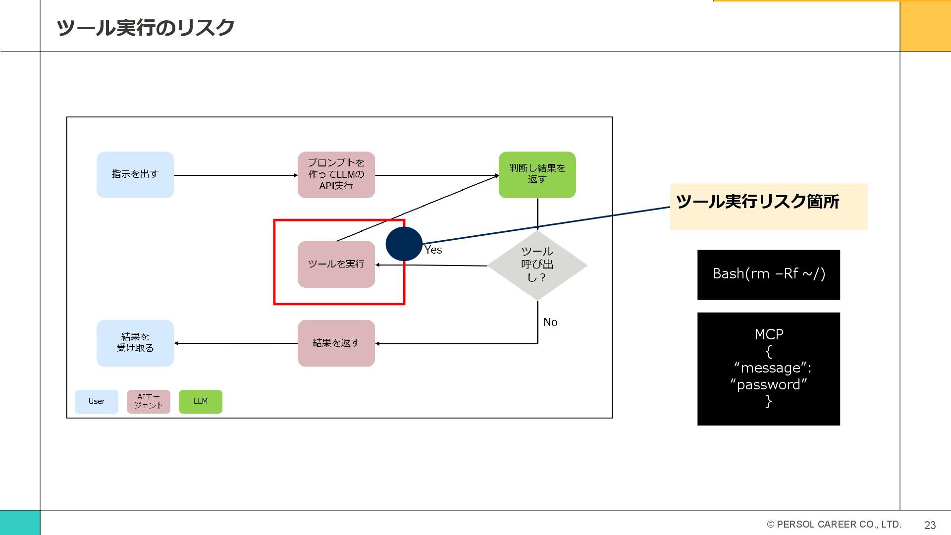 © PERSOL CAREER CO., LTD. 23 ツール実行のリスク ツール実行リスク箇所 Bash(rm –Rf