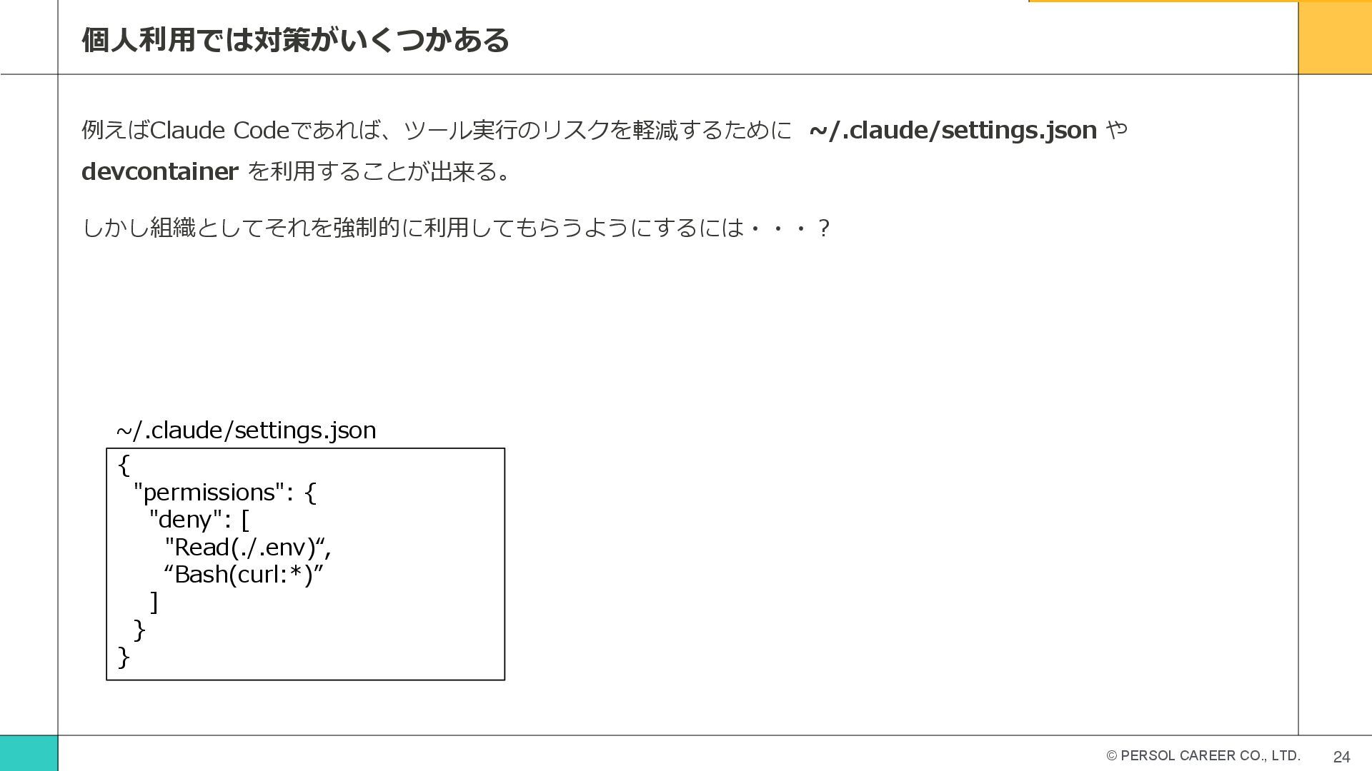 © PERSOL CAREER CO., LTD. 24 個人利用では対策がいくつかある 例えばClaude Codeであれば、ツール実行のリスクを軽減するために ~/.claude/settings.json