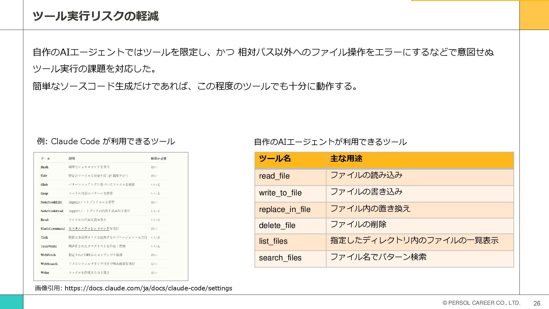 © PERSOL CAREER CO., LTD. 26 ツール実行リスクの軽減 自作のAIエージェントではツールを限定し、かつ 相対パス以外へのファイル操作をエラーにするなどで意図せぬ ツール実行の課題を対応した。