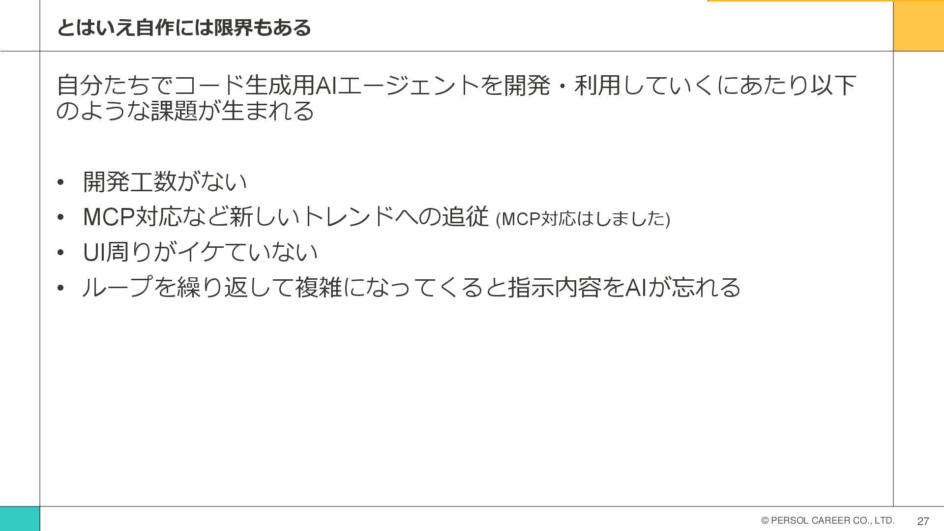 © PERSOL CAREER CO., LTD. 27 とはいえ自作には限界もある 自分たちでコード生成用AIエージェントを開発・利用していくにあたり以下 のような課題が生まれる •