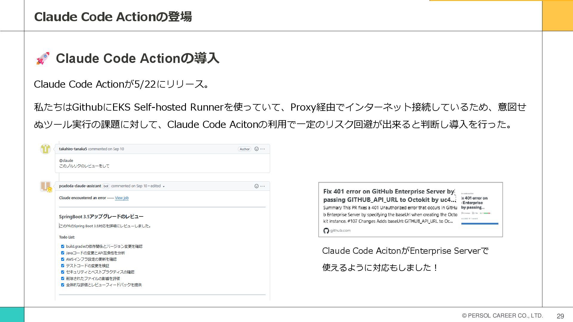 Code Actionの導入 Claude Code Actionが5/22にリリース。 私たちはGithubにEKS Self-hosted Runnerを使っていて、Proxy経由でインターネット接続しているため、意図せ ぬツール実行の課題に対して、Claude Code Acitonの利用で一定のリスク回避が出来ると判断し導入を行った。 Claude Code AcitonがEnterprise Serverで 使えるように対応もしました!
