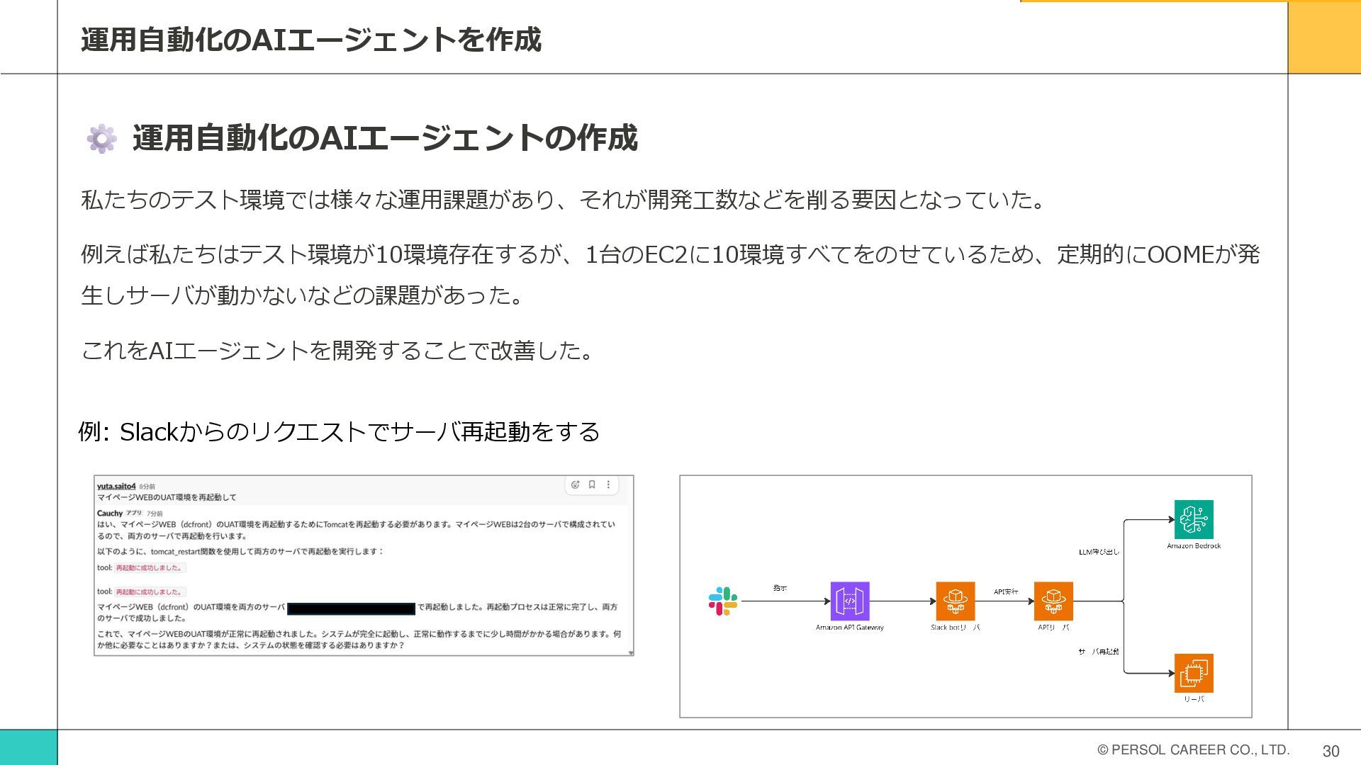 © PERSOL CAREER CO., LTD. 30 運用自動化のAIエージェントを作成 運用自動化のAIエージェントの作成 私たちのテスト環境では様々な運用課題があり、それが開発工数などを削る要因となっていた。 例えば私たちはテスト環境が10環境存在するが、1台のEC2に10環境すべてをのせているため、定期的にOOMEが発