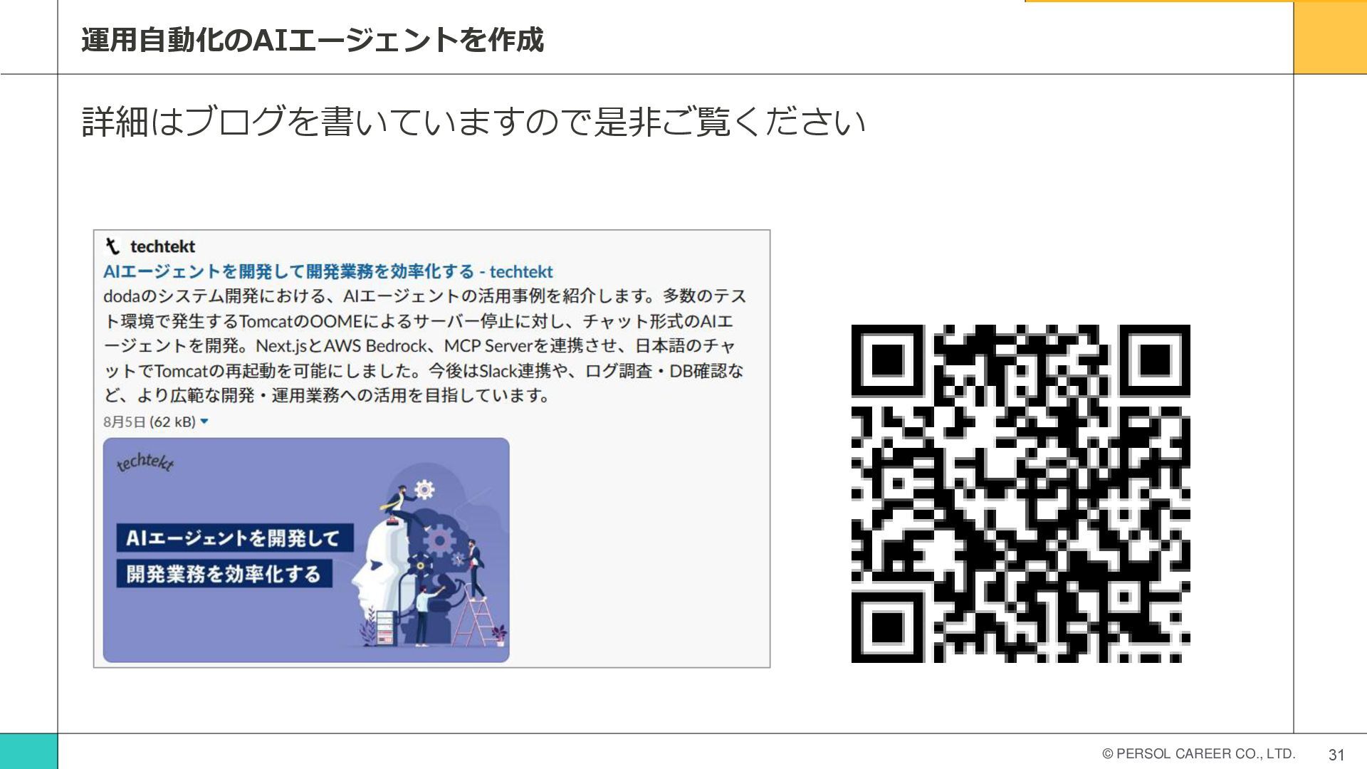 © PERSOL CAREER CO., LTD. 31 運用自動化のAIエージェントを作成 詳細はブログを書いていますので是非ご覧ください