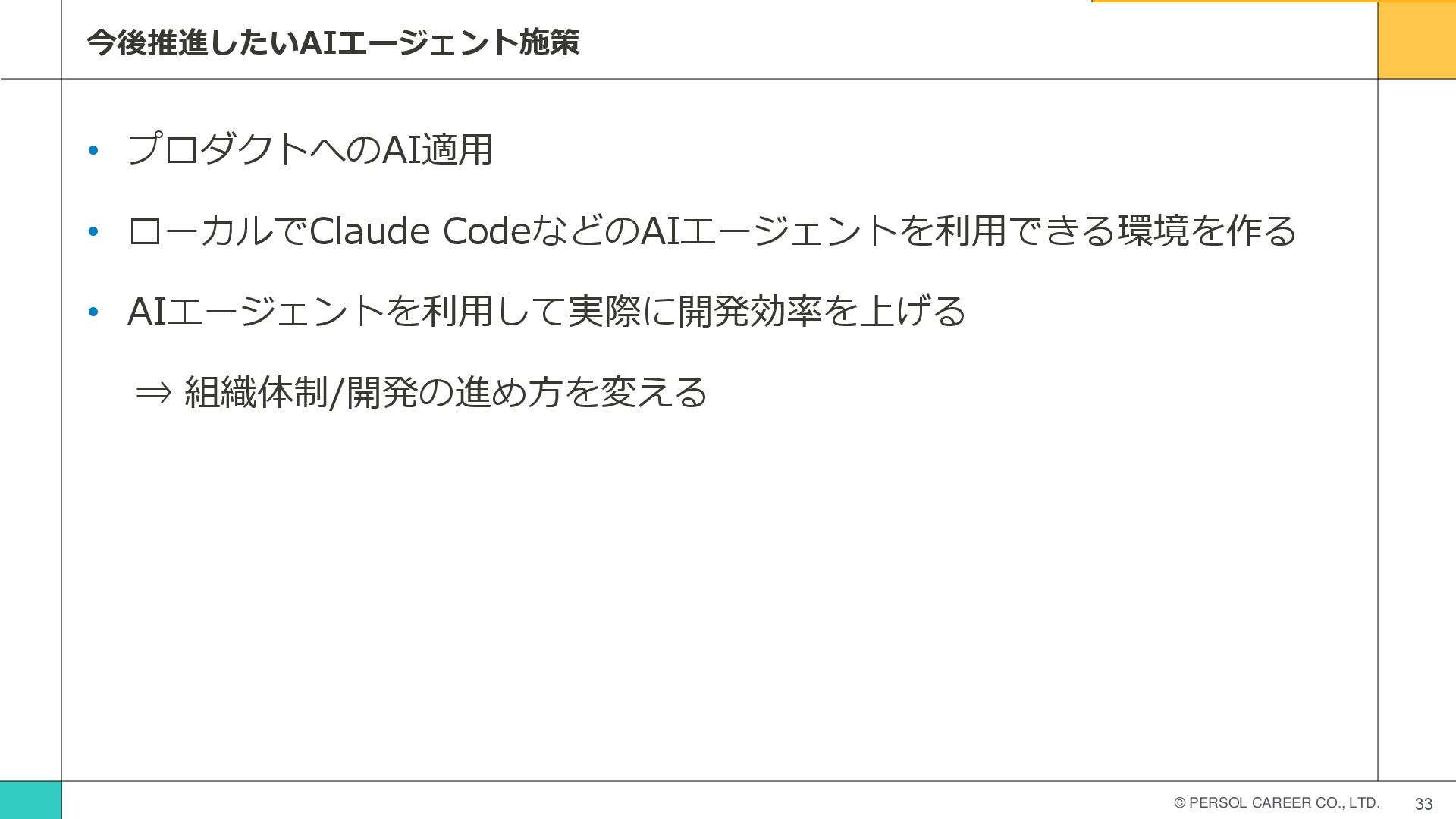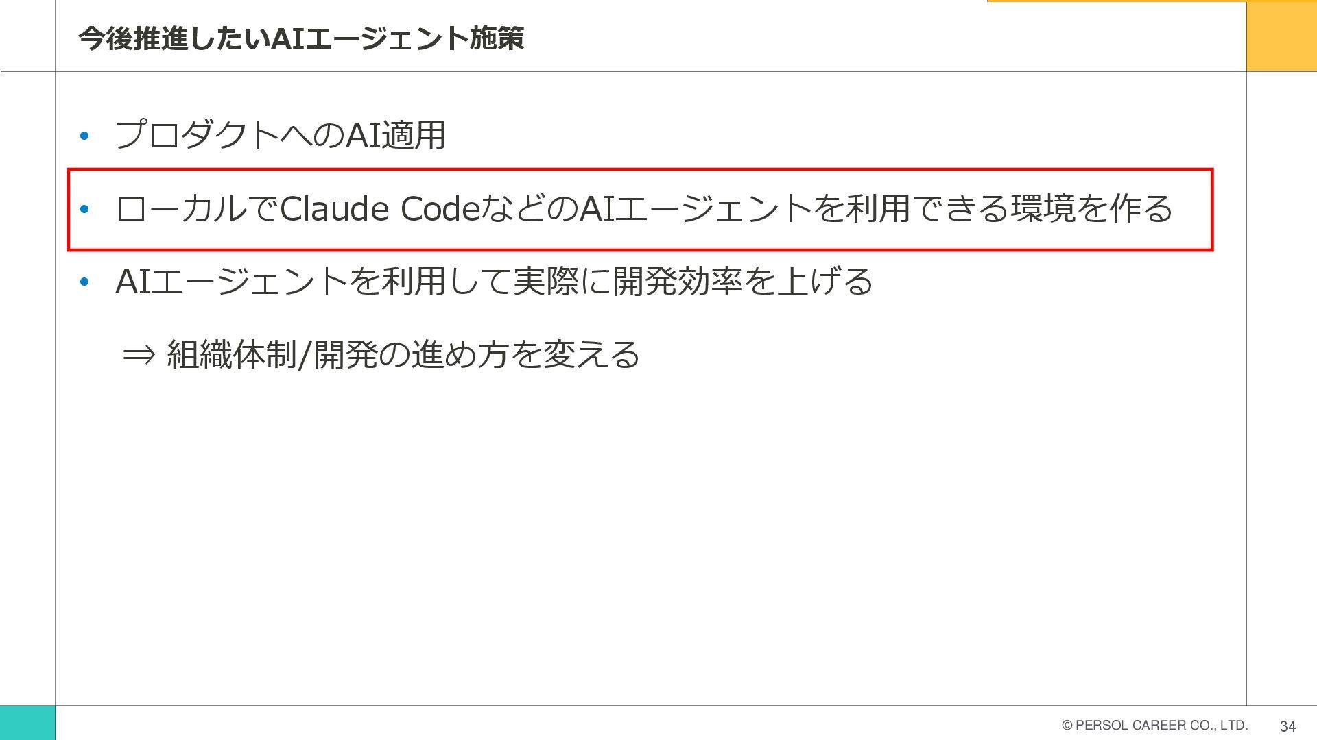 © PERSOL CAREER CO., LTD. 33 今後推進したいAIエージェント施策 • プロダクトへのAI適用 •