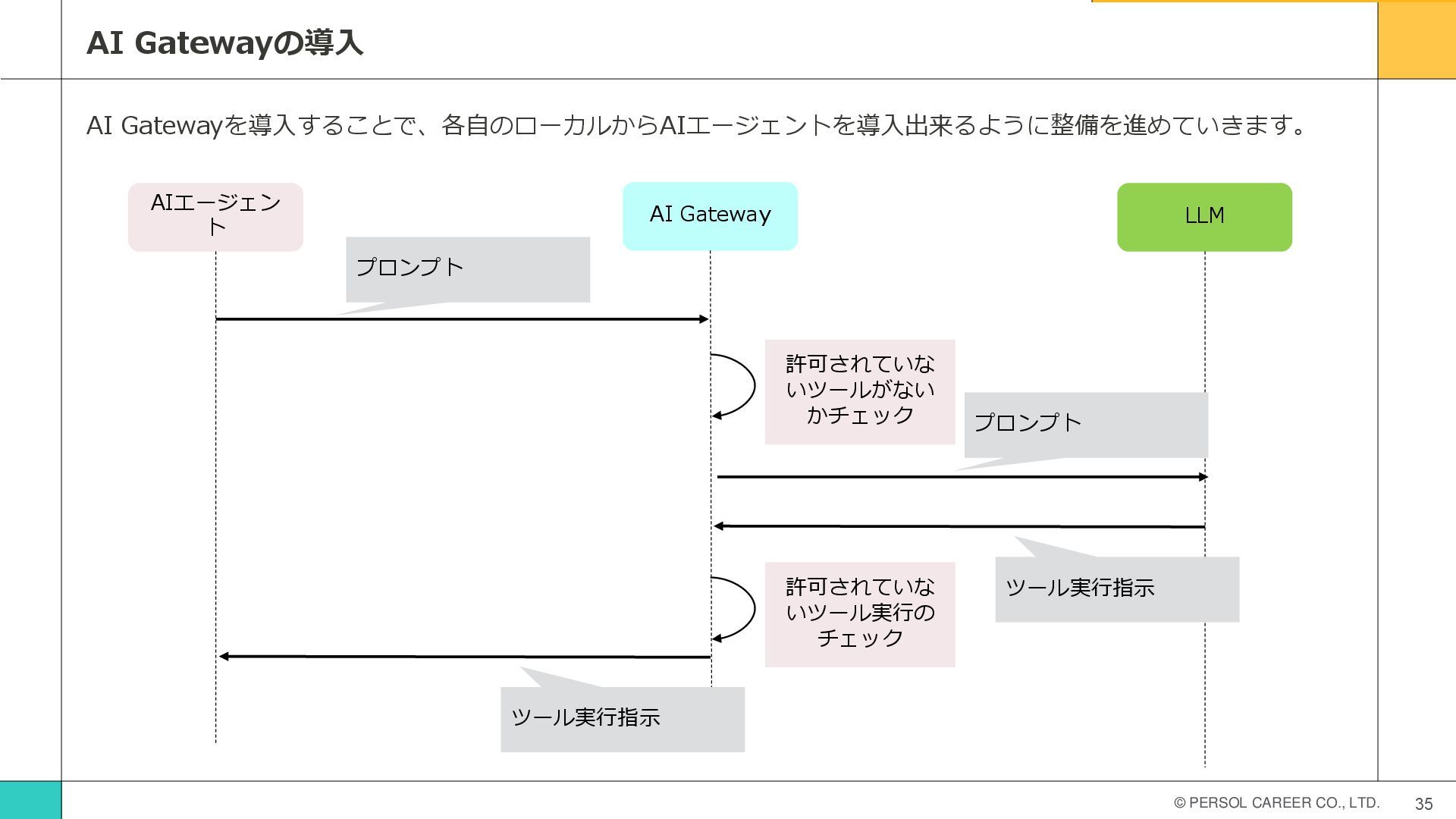 © PERSOL CAREER CO., LTD. 35 AI Gatewayの導入 AI Gatewayを導入することで、各自のローカルからAIエージェントを導入出来るように整備を進めていきます。