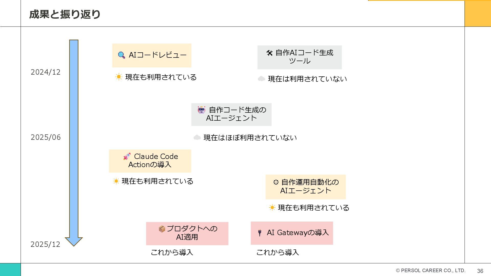 現在も利用されている 現在は利用されていない 2024/12 2025/06 2025/12 自作コード生成の AIエージェント 現在はほぼ利用されていない Claude Code Actionの導入 現在も利用されている 自作運用自動化の AIエージェント 現在も利用されている AI Gatewayの導入 これから導入 プロダクトへの AI適用 これから導入