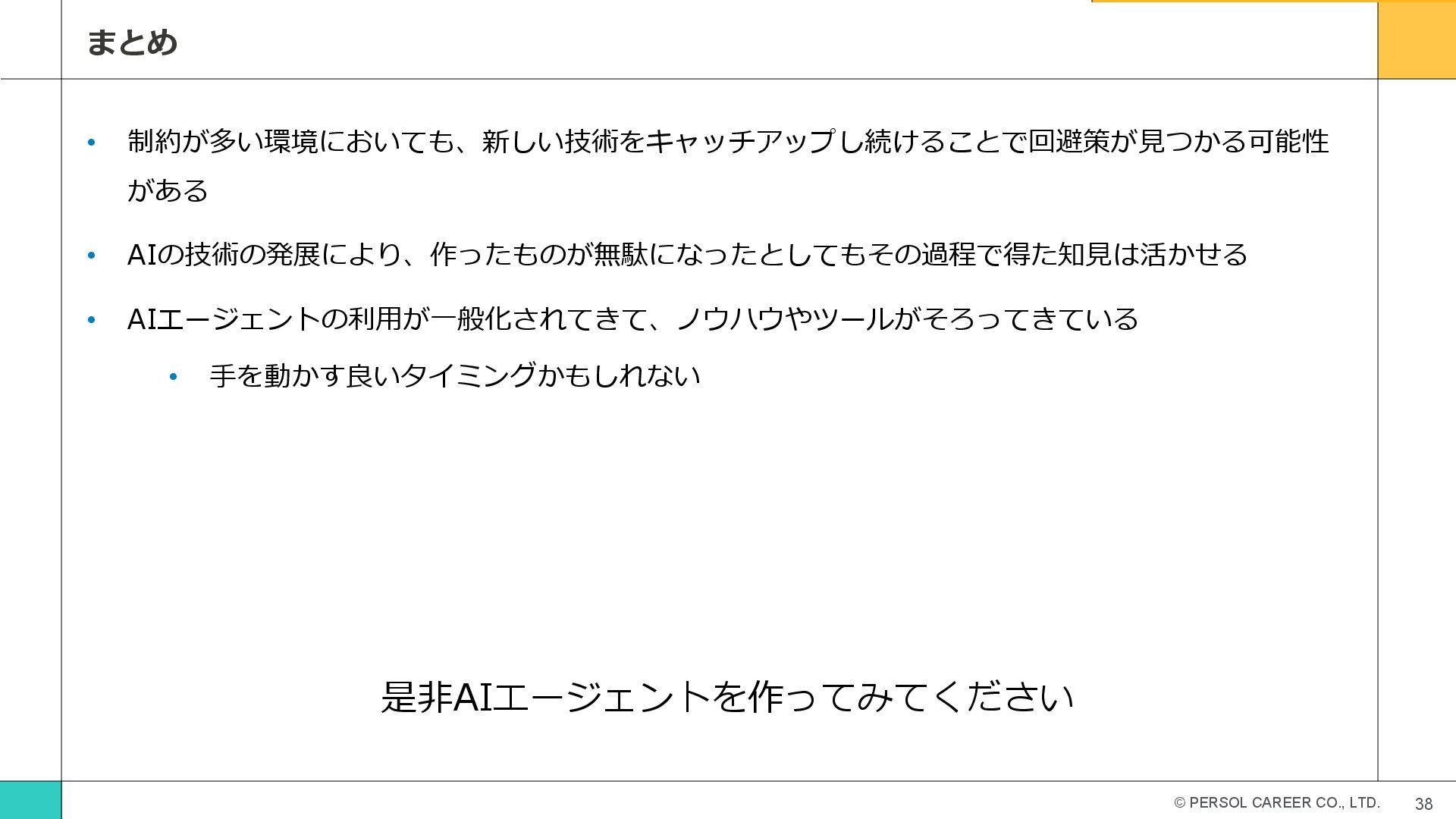 • AIの技術の発展により、作ったものが無駄になったとしてもその過程で得た知見は活かせる • AIエージェントの利用が一般化されてきて、ノウハウやツールがそろってきている • 手を動かす良いタイミングかもしれない 是非AIエージェントを作ってみてください