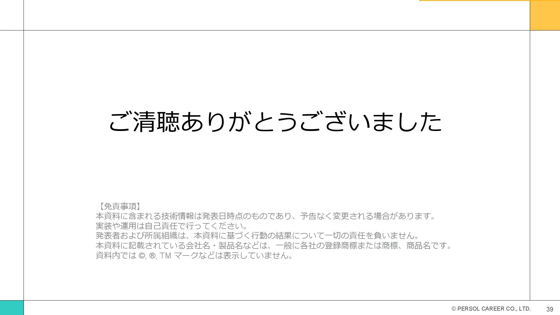 © PERSOL CAREER CO., LTD. ご清聴ありがとうございました 39 【免責事項】 本資料に含まれる技術情報は発表日時点のものであり、予告なく変更される場合があります。 実装や運用は自己責任で行ってください。