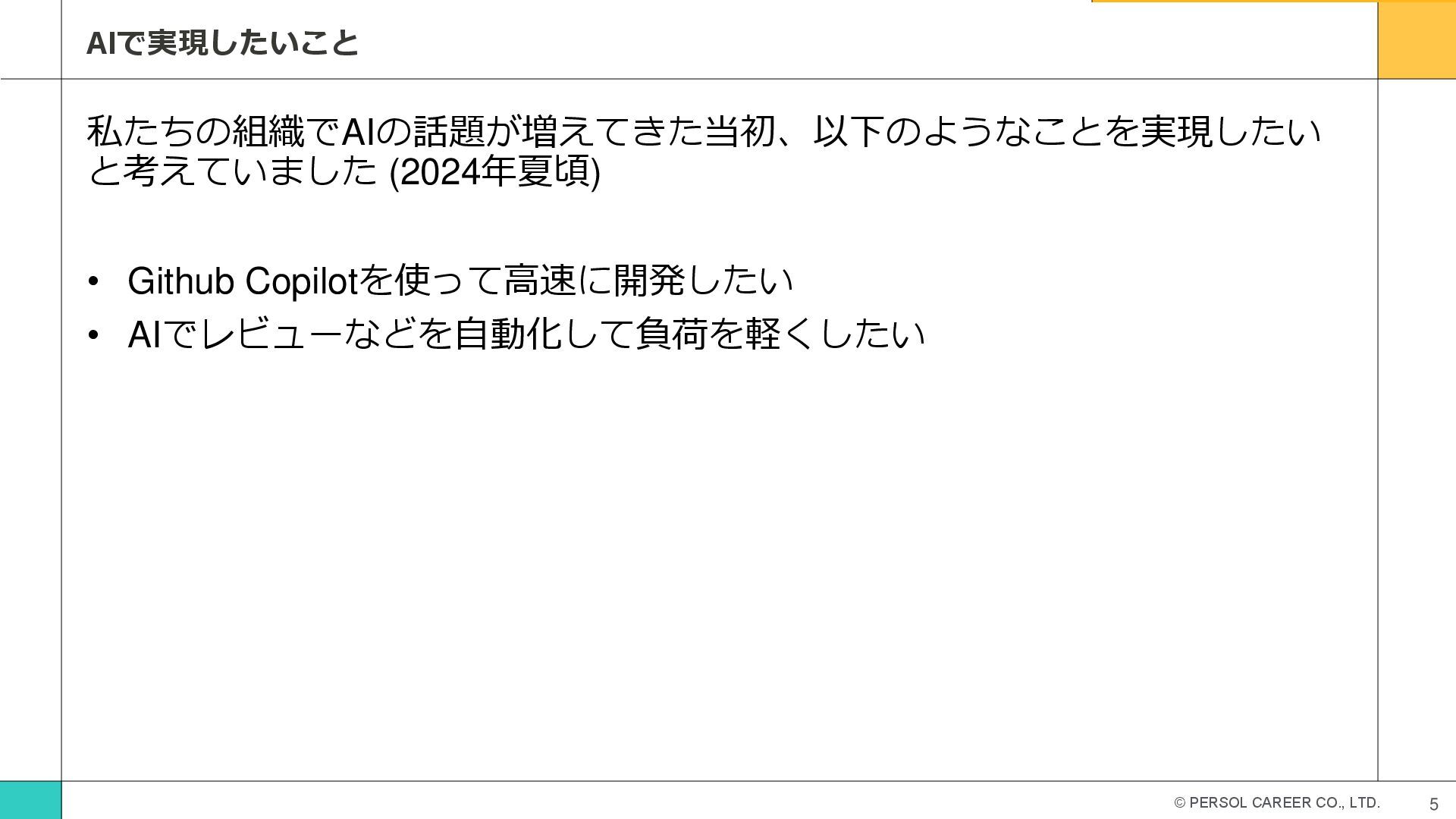 • Github Copilotを使って高速に開発したい • AIでレビューなどを自動化して負荷を軽くしたい