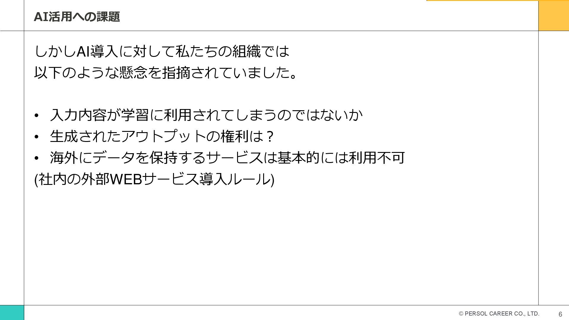 © PERSOL CAREER CO., LTD. 6 AI活用への課題 しかしAI導入に対して私たちの組織では 以下のような懸念を指摘されていました。 •
