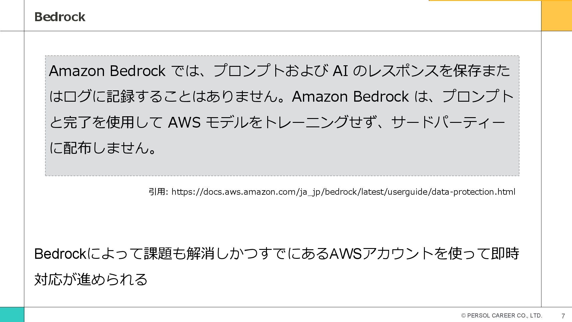 © PERSOL CAREER CO., LTD. 7 Bedrock Bedrockによって課題も解消しかつすでにあるAWSアカウントを使って即時 対応が進められる Amazon