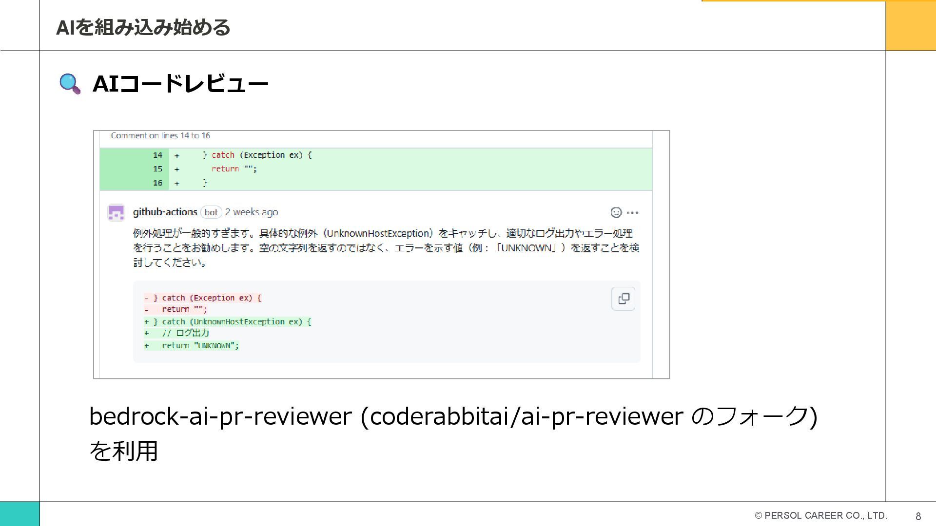 © PERSOL CAREER CO., LTD. 8 AIを組み込み始める AIコードレビュー bedrock-ai-pr-reviewer (coderabbitai/ai-pr-reviewer