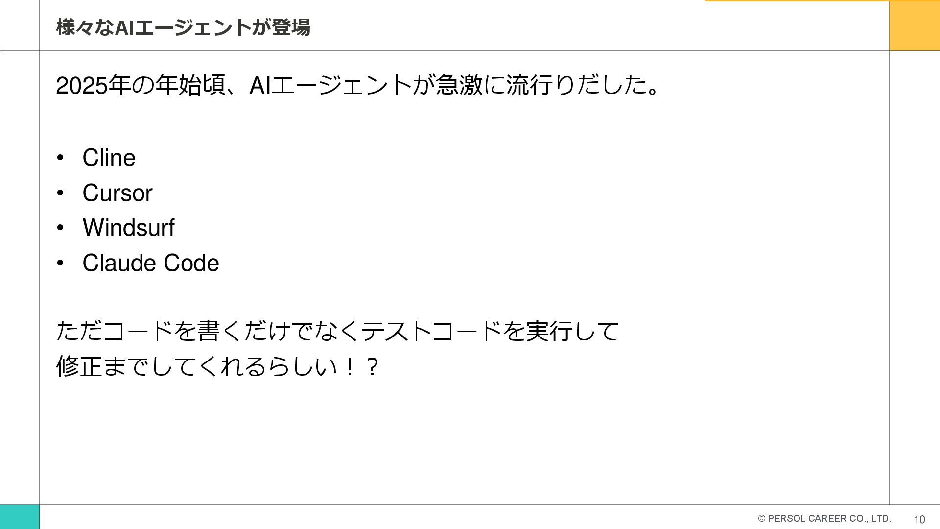 © PERSOL CAREER CO., LTD. 10 様々なAIエージェントが登場 2025年の年始頃、AIエージェントが急激に流行りだした。 • Cline