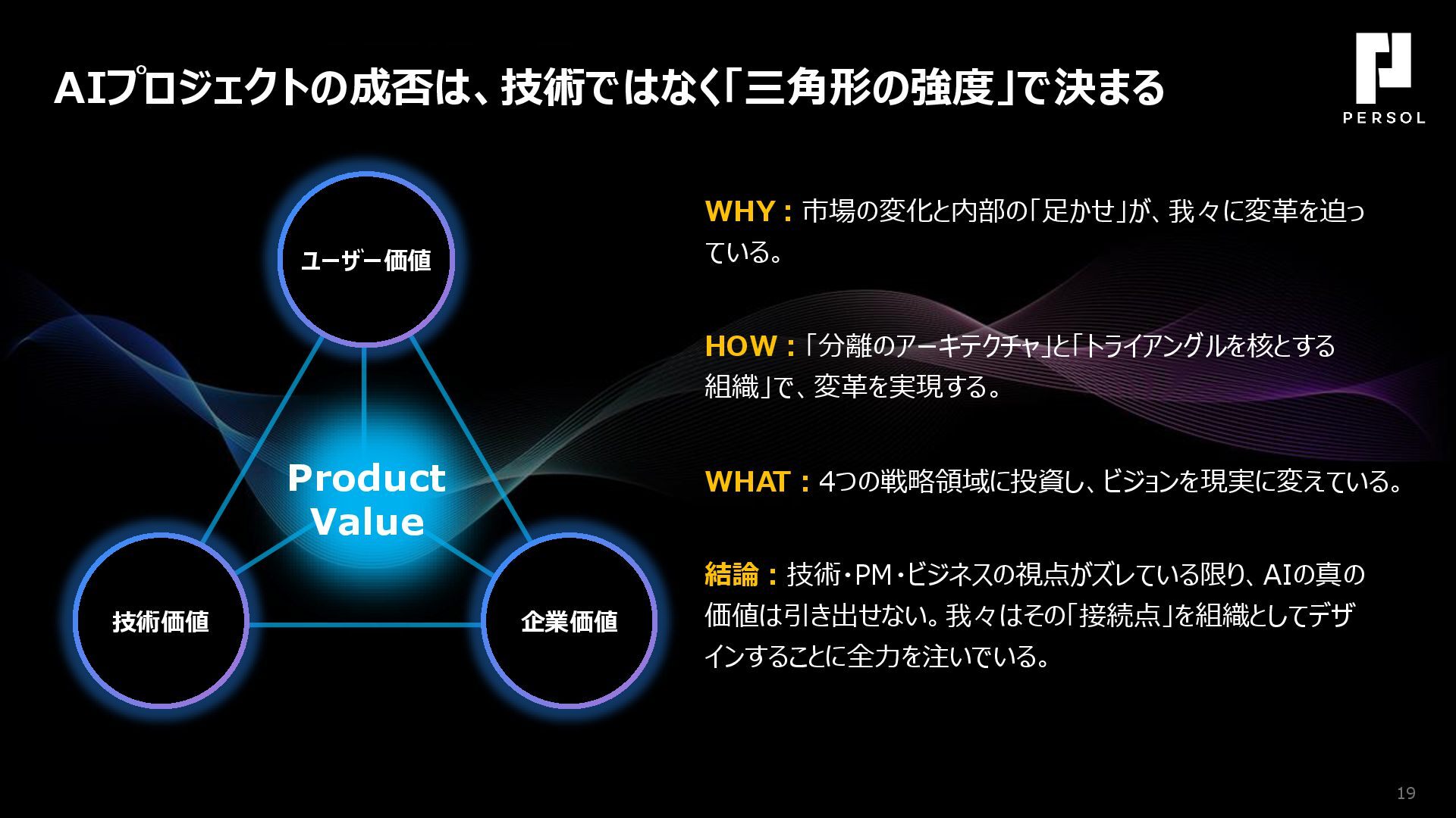 ない。技術・PM・ビジネスの視点がズレている 限り、AIの真の価値は引き出せない。 • プロダクトマネジメント・トライアングル:この 3つの視点の交点にこそ、真のプロダクト価値 が生まれる。 • 我々のゴールは、この三角形の強度とバランス を最大化する「組織」そのものをデザインするこ と。 真の プロダクト価値