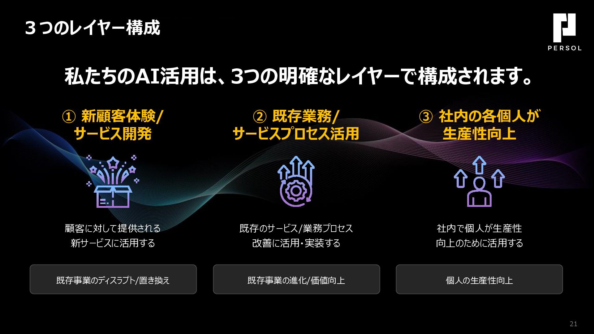 5. 既存事業のディスラプト/置き換え 21 3つのレイヤー構成 私たちのAI活用は、3つの明確なレイヤーで構成されます。 顧客に対して提供される 新サービスに活用する ① 新顧客体験/ サービス開発 既存のサービス/業務プロセス