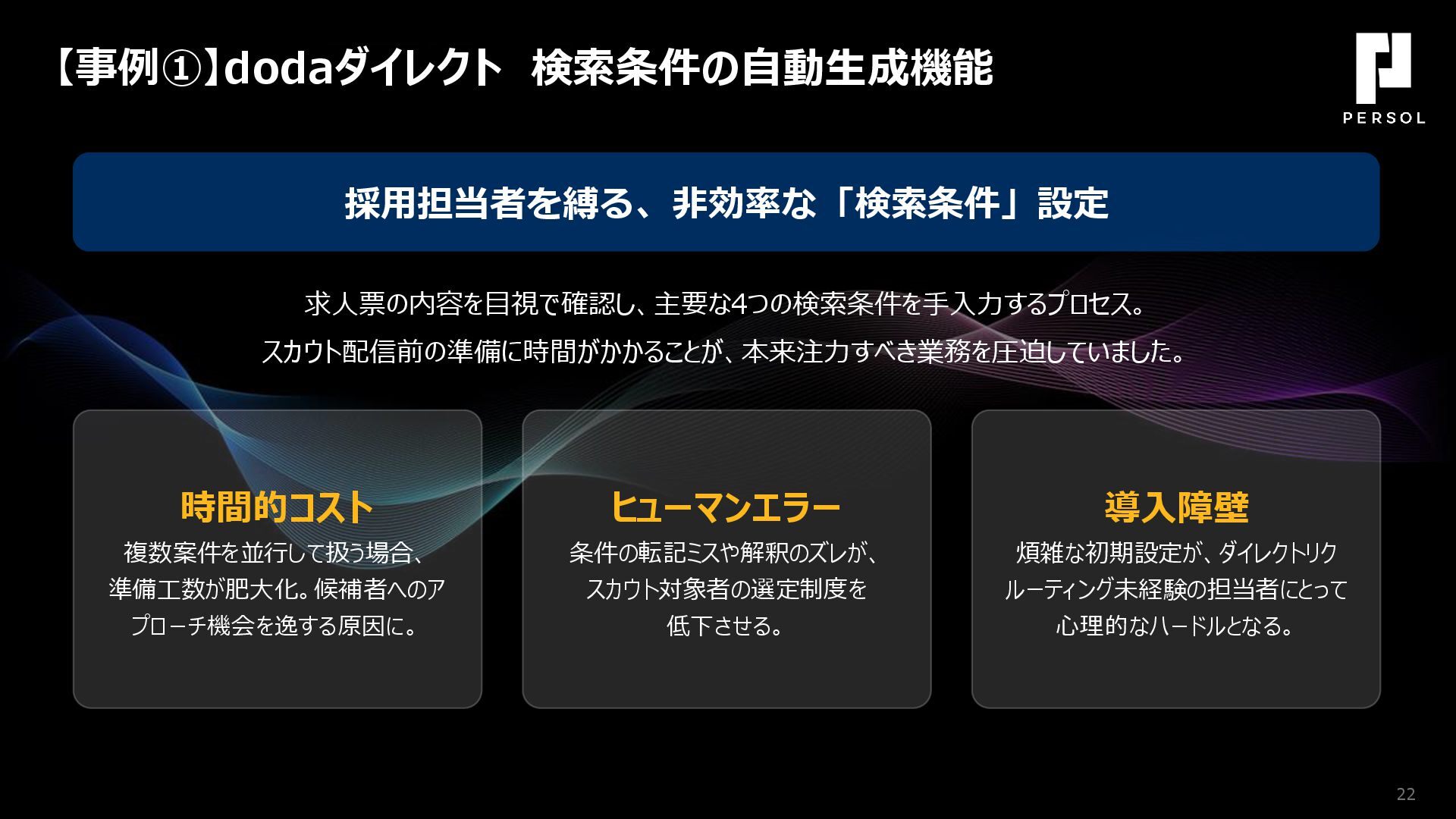 ルーティング未経験の担当者にとって 心理的なハードルとなる。 22 【事例①】dodaダイレクト 検索条件の自動生成機能 求人票の内容を目視で確認し、主要な4つの検索条件を手入力するプロセス。 スカウト配信前の準備に時間がかかることが、本来注力すべき業務を圧迫していました。 採用担当者を縛る、非効率な「検索条件」設定