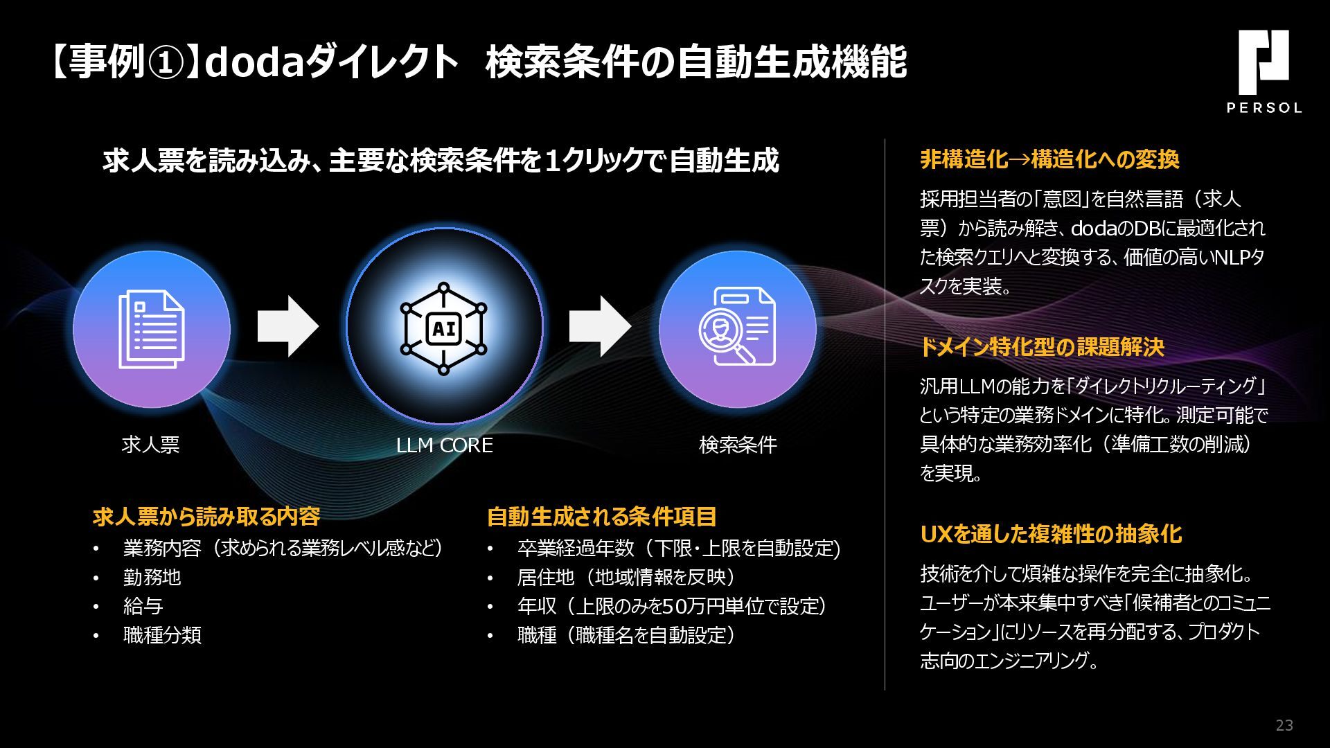 7. 23 【事例①】dodaダイレクト 検索条件の自動生成機能 求人票 LLM CORE 求人票を読み込み、主要な検索条件を1クリックで自動生成 求人票から読み取る内容 • 業務内容(求められる業務レベル感など)