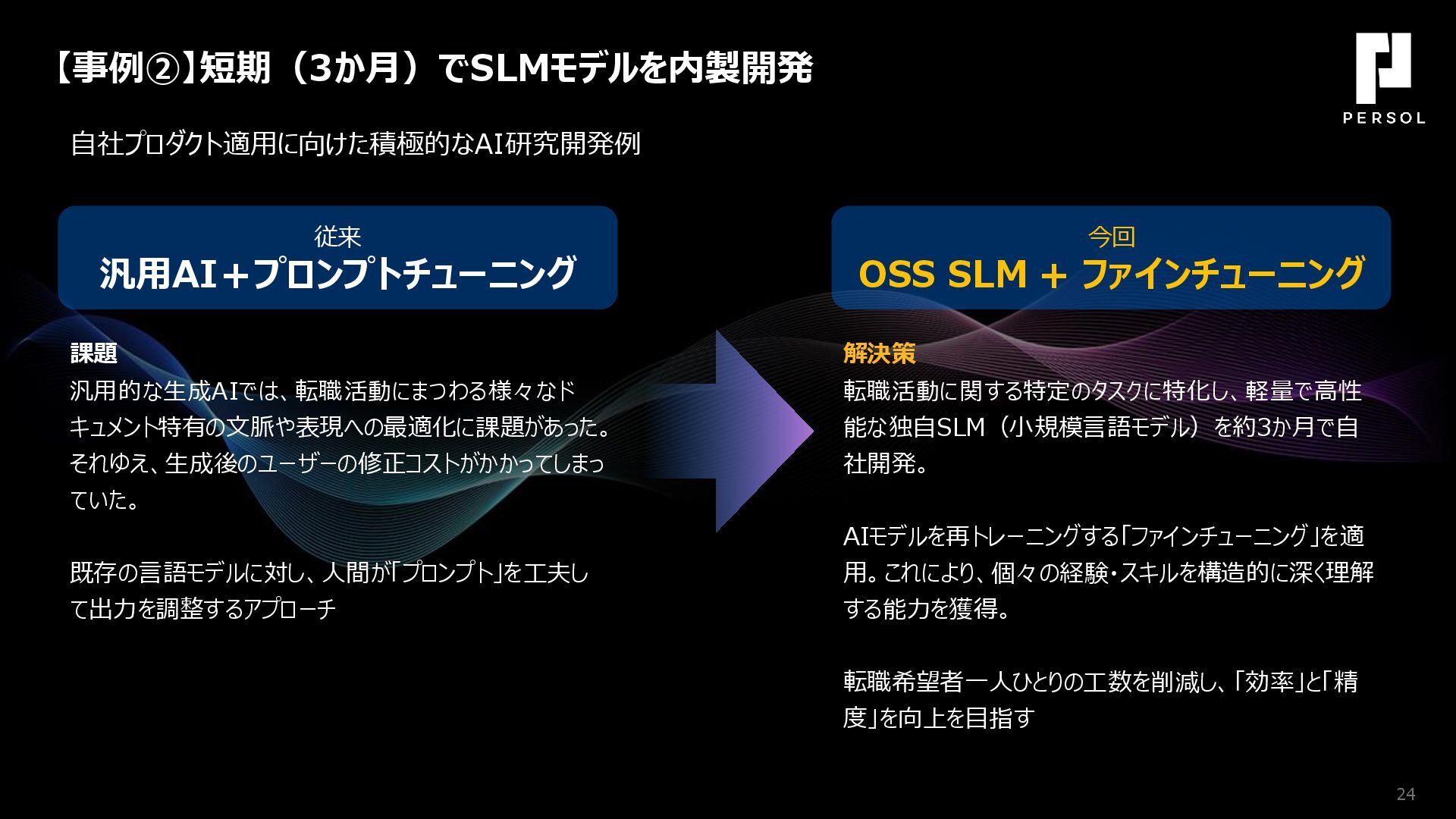 解決策 転職活動に関する特定のタスクに特化し、軽量で高性 能な独自SLM(小規模言語モデル)を約3か月で自 社開発。 AIモデルを再トレーニングする「ファインチューニング」を適 用。これにより、個々の経験・スキルを構造的に深く理解 する能力を獲得。 転職希望者一人ひとりの工数を削減し、「効率」と「精 度」を向上を目指す 従来 汎用AI+プロンプトチューニング 今回 OSS SLM + ファインチューニング