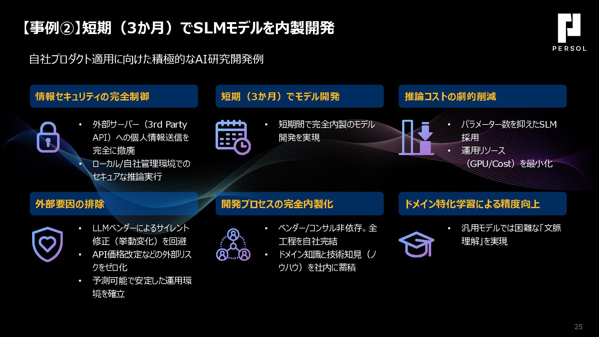 • LLMベンダーによるサイレント 修正(挙動変化)を回避 • API価格改定などの外部リス クをゼロ化 • 予測可能で安定した運用環 境を確立 • 短期間で完全内製のモデル 開発を実現 • ベンダー/コンサル非依存。全 工程を自社完結 • ドメイン知識と技術知見(ノ ウハウ)を社内に蓄積 • パラメーター数を抑えたSLM 採用 • 運用リソース (GPU/Cost)を最小化 • 汎用モデルでは困難な「文脈 理解」を実現 自社プロダクト適用に向けた積極的なAI研究開発例 情報セキュリティの完全制御 短期(3か月)でモデル開発 推論コストの劇的削減 外部要因の排除 開発プロセスの完全内製化 ドメイン特化学習による精度向上