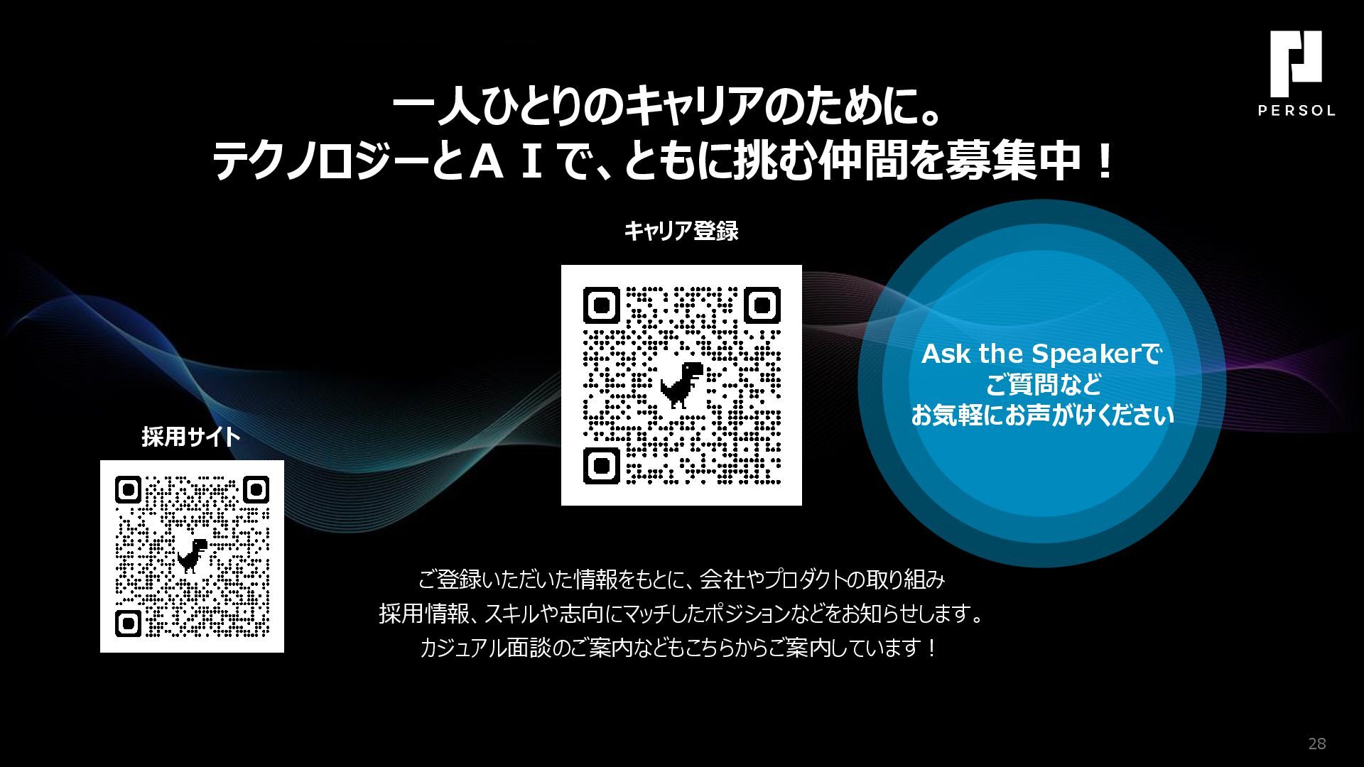 10. 28 一人ひとりのキャリアのために。 テクノロジーとAIで、ともに挑む仲間を募集中! Ask the Speakerで ご質問など お気軽にお声がけください キャリア登録 採用サイト