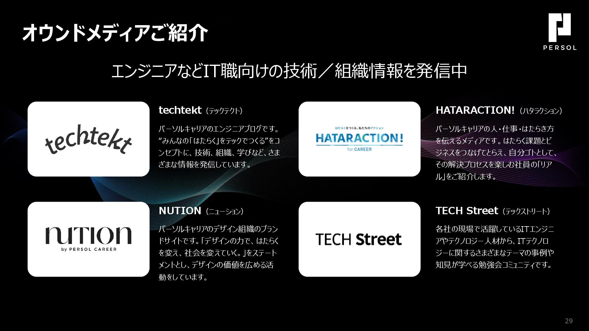 ル」をご紹介します。 エンジニアなどIT職向けの技術/組織情報を発信中 techtekt(テックテクト) HATARACTION!(ハタラクション) パーソルキャリアのデザイン組織のブラン ドサイトです。「デザインの力で、はたらく を変え、社会を変えていく。」をステート メントとし、デザインの価値を広める活 動をしています。 NUTION(ニューション) 各社の現場で活躍しているITエンジニ アやテクノロジー人材から、ITテクノロ ジーに関するさまざまなテーマの事例や 知見が学べる勉強会コミュニティです。 TECH Street(テックストリート)