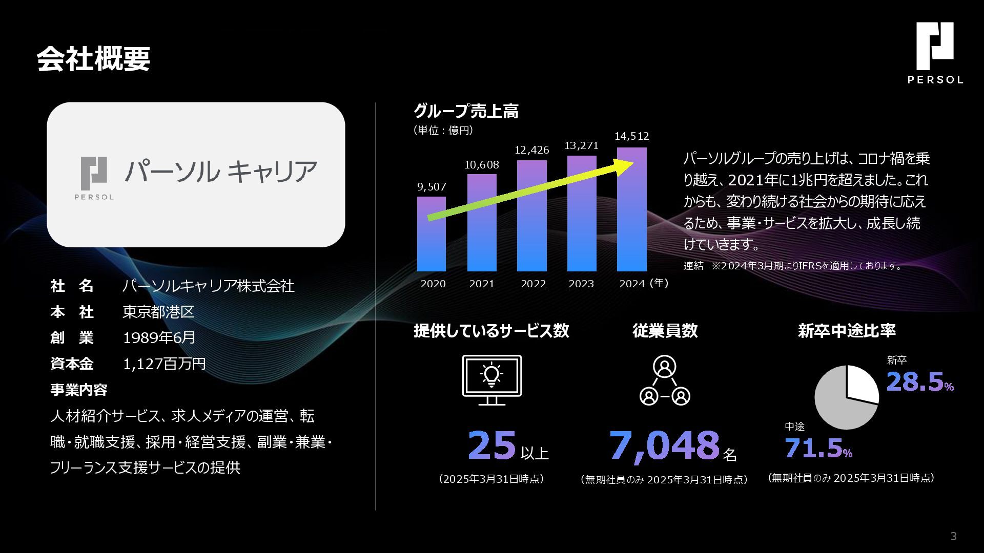 1989年6月 資本金 1,127百万円 事業内容 人材紹介サービス、求人メディアの運営、転 職・就職支援、採用・経営支援、副業・兼業・ フリーランス支援サービスの提供 パーソルグループの売り上げは、コロナ禍を乗 り越え、2021年に1兆円を超えました。これ からも、変わり続ける社会からの期待に応え るため、事業・サービスを拡大し、成長し続 けていきます。 連結 ※2024年3月期よりIFRSを適用しております。 グループ売上高 9,507 10,608 12,426 13,271 14,512 2024 2023 2022 2021 2020 (単位:億円) 提供しているサービス数 従業員数 新卒中途比率 以上 (2025年3月31日時点) (無期社員のみ 2025年3月31日時点) (無期社員のみ 2025年3月31日時点) (年) 25 名 7,048 新卒 28.5 % 71.5 % 中途